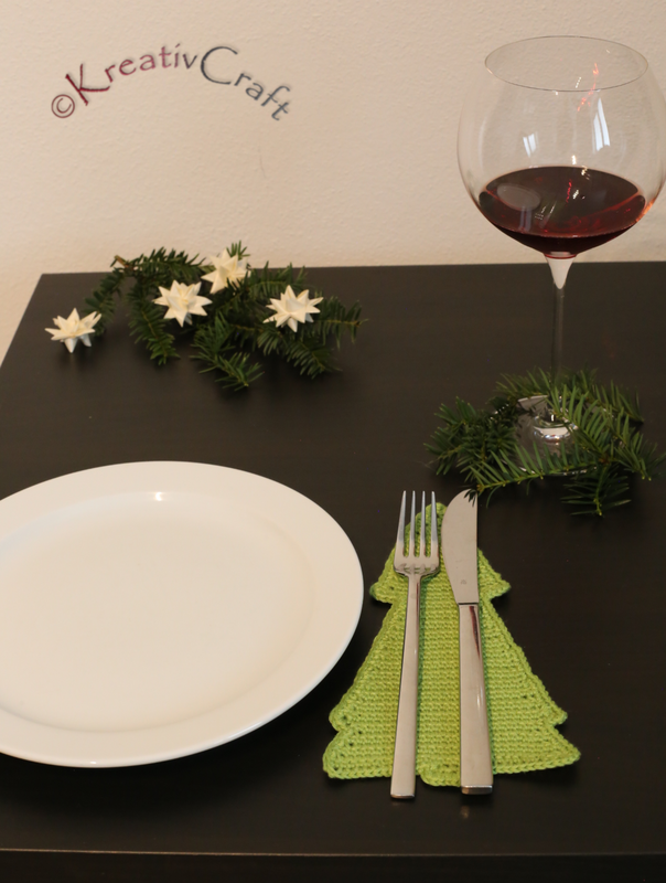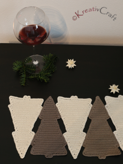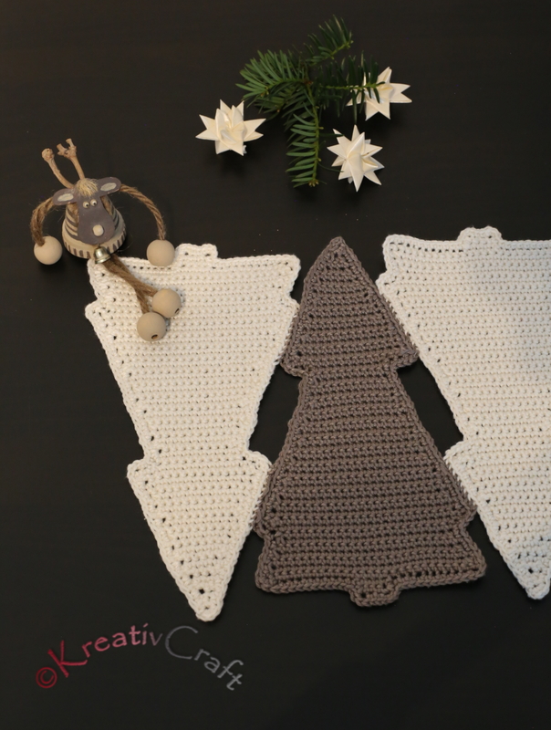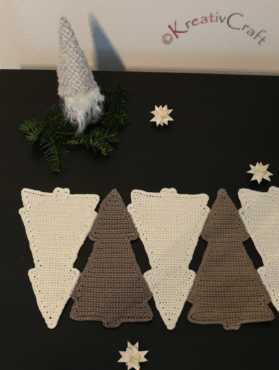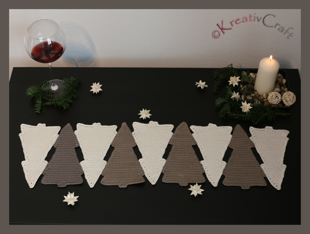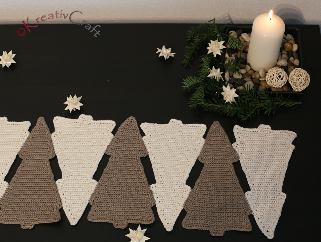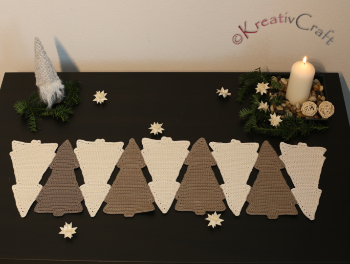 With a hook size of 3 and the appropriate yarn a single fir tree will be approx. 21 cm high and 11,5 cm wide. If 9 fir trees are arranged the table runner has a length of approx. 81 cm.