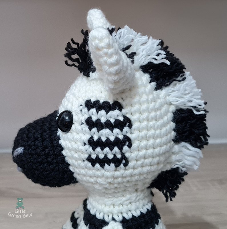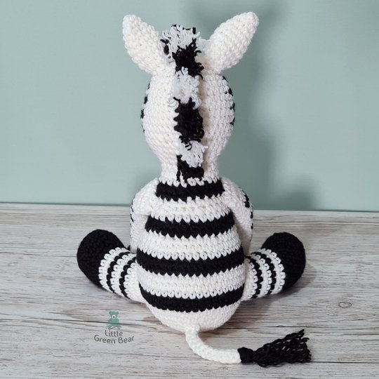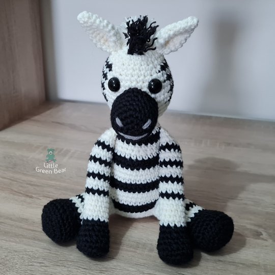 Zach the zebra spends his day grazing with family and friends on the savanna. Lions might think they look like an easy meal, but be warned, they have a ferocious bite and a very strong kick! He sits 10 inches tall (when made with the recommended materials).