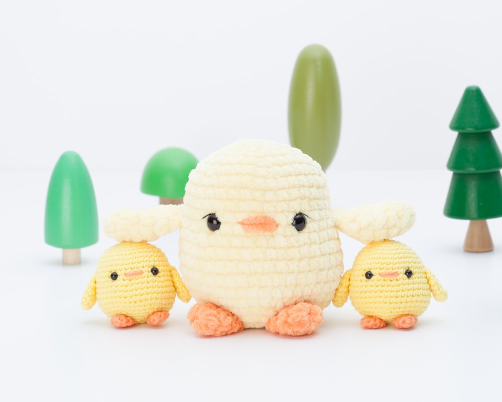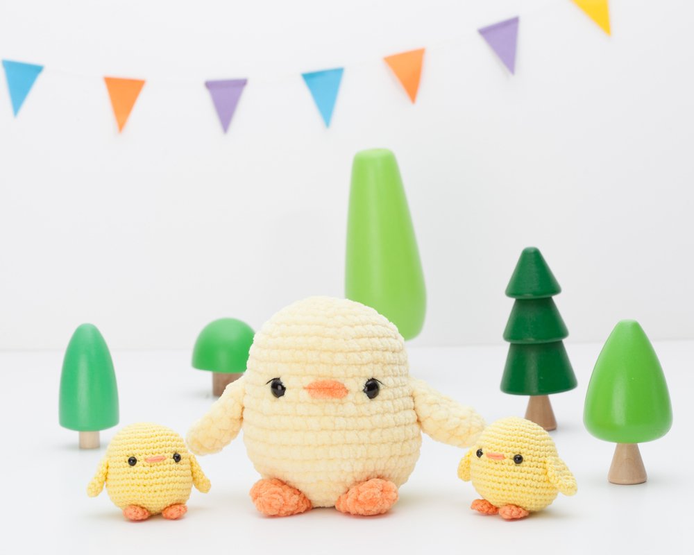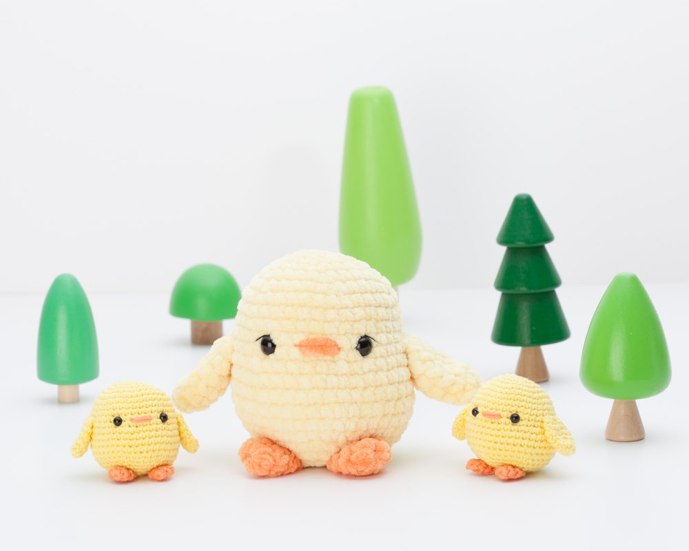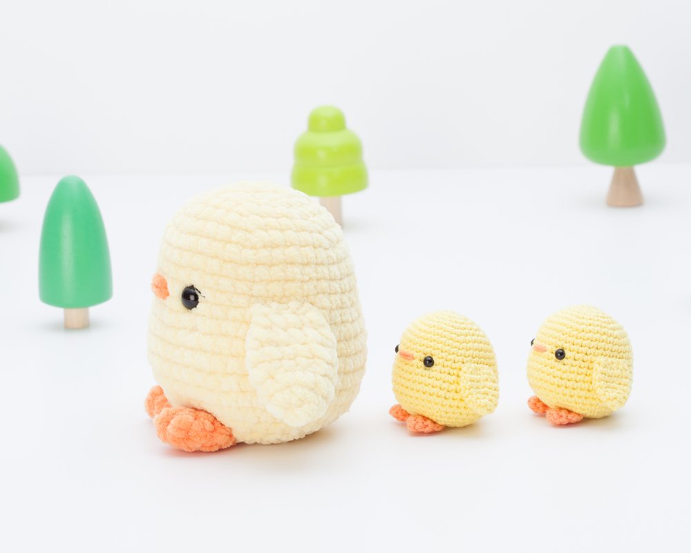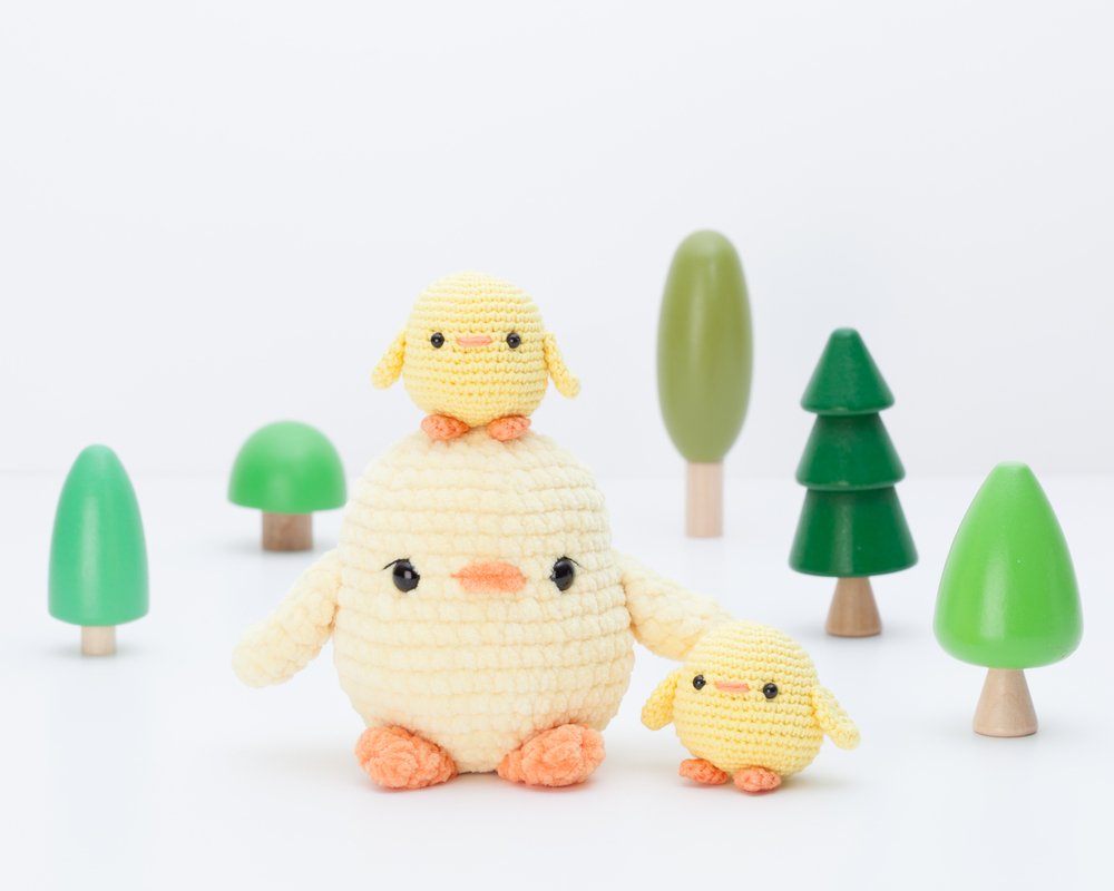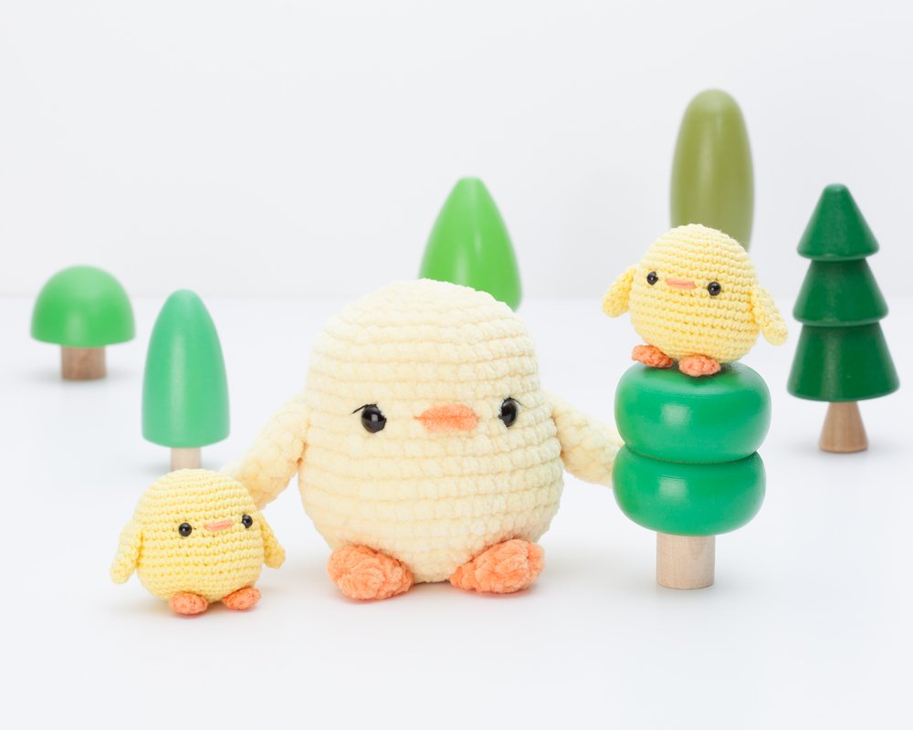 If you use the yarn and hook indicated, the big chick will be about 10.5 cm (4.1 inches) tall and the small one will be about 5 cm (1,9 inches) tall. You can make it bigger or smaller using another type of yarn but, please, adapt the crochet hook and eyes accordingly.