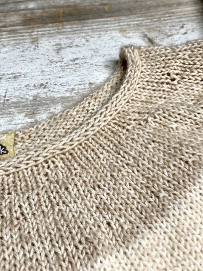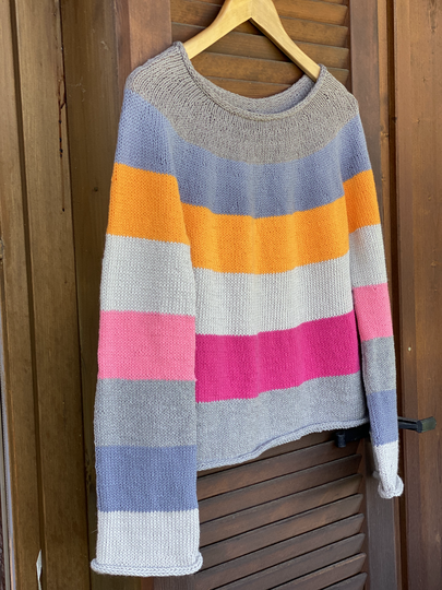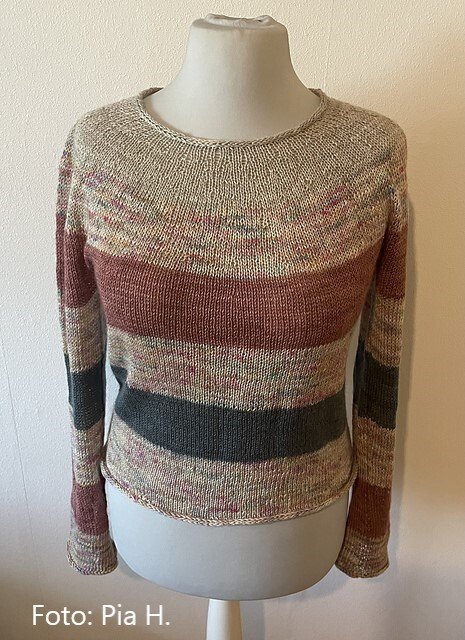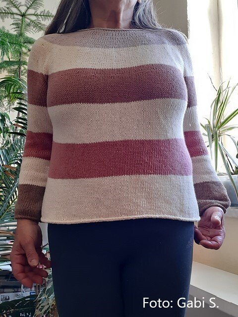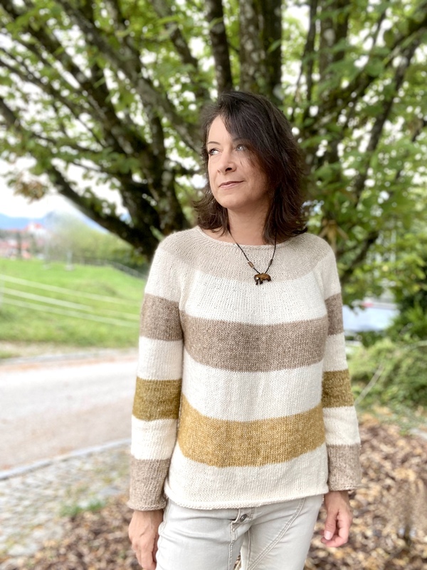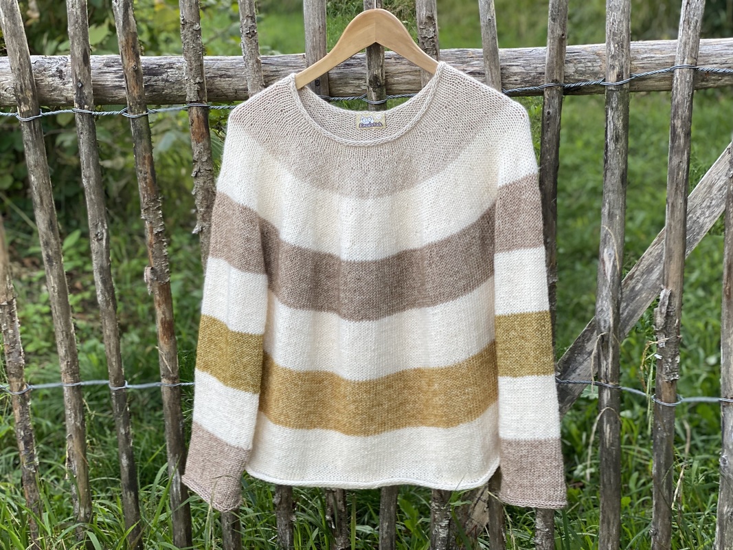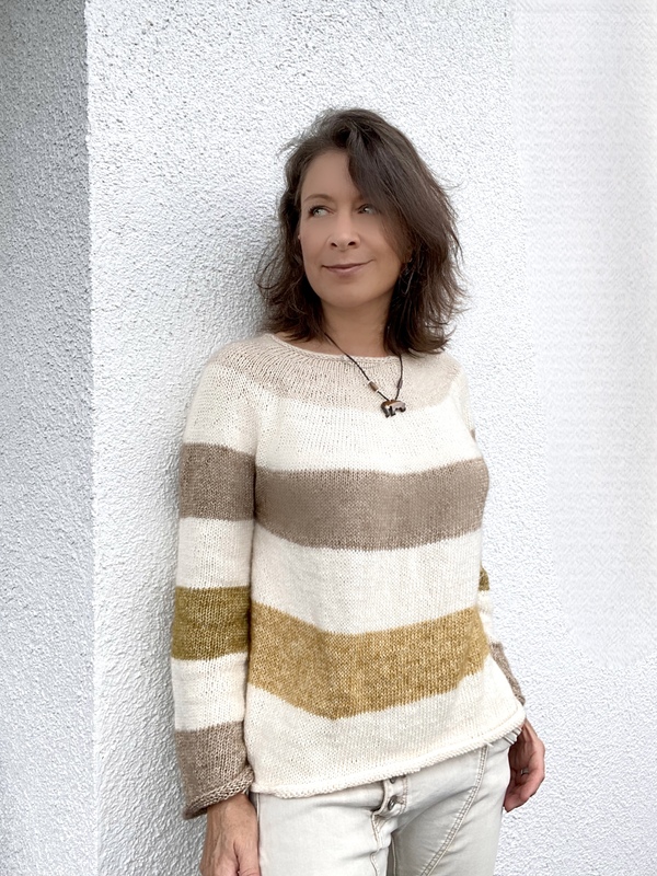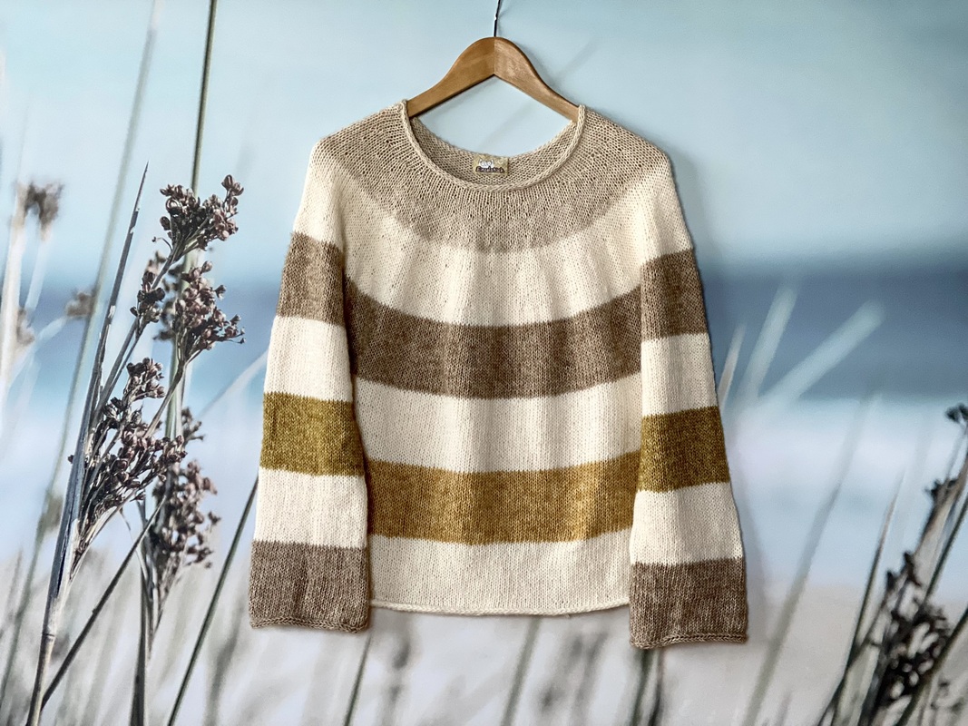 This cozy basic round yoke sweater is a seamless top-down construction. It is worked in plain Stockinette stitch, complete with stripes.