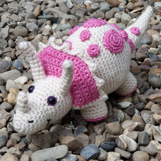 Terry the little triceratops just loves roaming the marshes and forests, with his friend Tilda, looking for tasty plants for lunch - they sometimes enjoy a “who can knock the tree over first” competition (Tilda usually wins). He is 13 inches long and 5 inches wide (when made with the recommended materials).