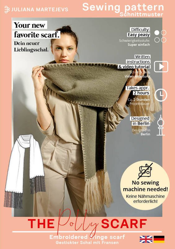 The no-knit scarf sewing pattern The Polly Scarf is a stylish and sustainable accessory designed for the modern fashion enthusiast. Crafted with care and precision, this no-knit scarf pattern allows you to sew a fringe scarf made from certified wool, ensuring both quality and eco-consciousness in every stitch. The scarf pattern comes with a video tutorial and written instructions guiding you through the process of adding playful fringes, giving your scarf a fashionable edge that effortlessly enhances any outfit.