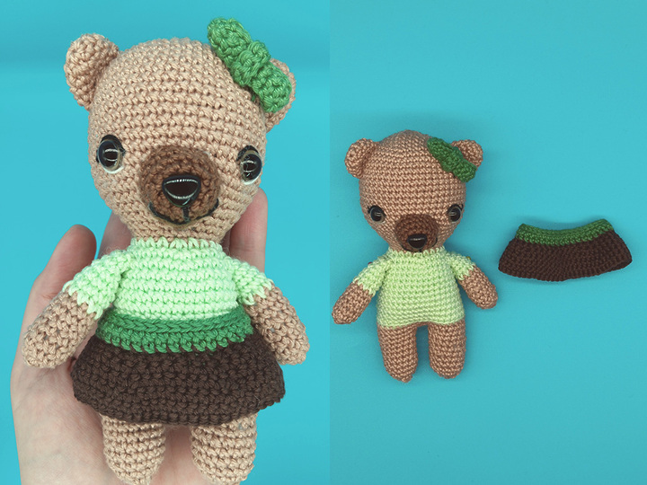 Papa und Mama Bär erreichen bei der angegebenen Material- und Nadelstärke eine Größe von ca. 25 cm. Lotti und Bruno sind ca. 18 cm groß.