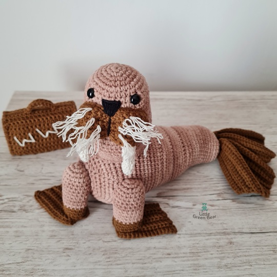 Wally the walrus was fed up with lockdown. He packed his little suitcase, jumped onto the first iceberg he could find and off he went. He visited Ireland first and then moved on to Tenby where he stayed for a while, watching the lifeboat launch, posing for the humans who came to visit him and dining out every day on the delicious local seafood. Now he’s on his travels again. He popped into Cornwall to say hello and then headed off to France, who knows where he’ll turn up next! He is just over 12 inches long - including flippers (when made with the recommended materials).