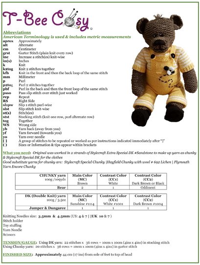 Finished bear standing up measure approx 44 cm (17 ins), but obviously as it is a toy using any yarn and needles will give you a smaller or larger bear