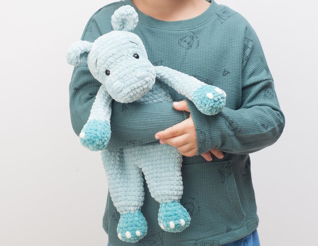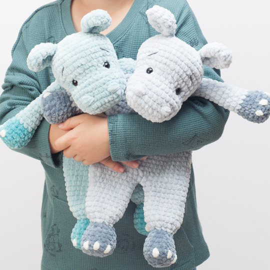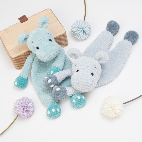 If you use the yarn and hook indicated, the hippo snuggler will be about 31 cm (12.2 inches) tall. You can make it bigger or smaller by using another type of yarn but please, adapt the crochet hook and eyes accordingly.