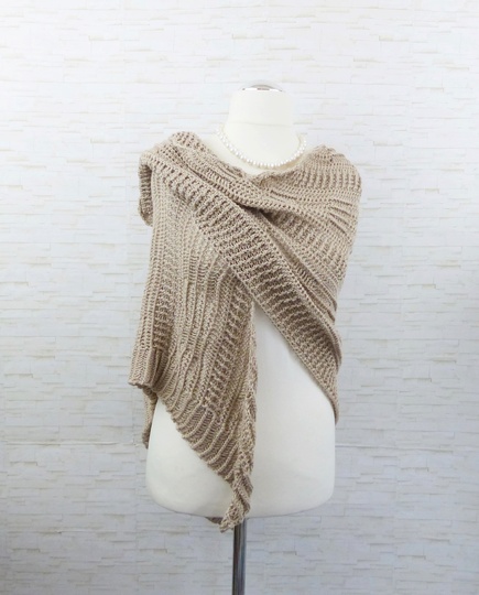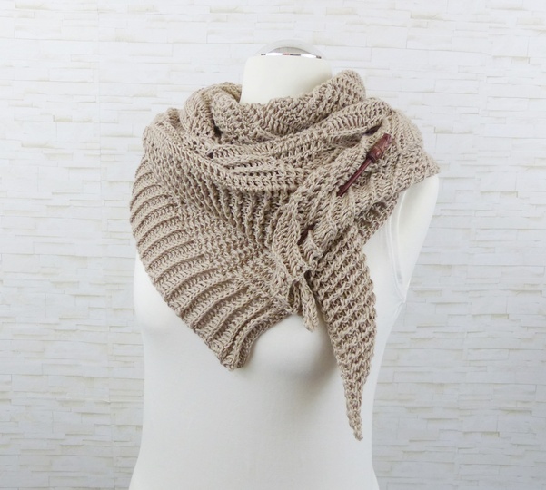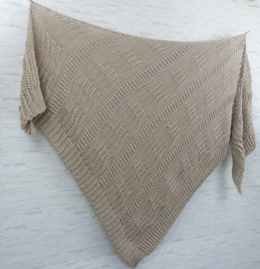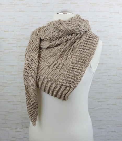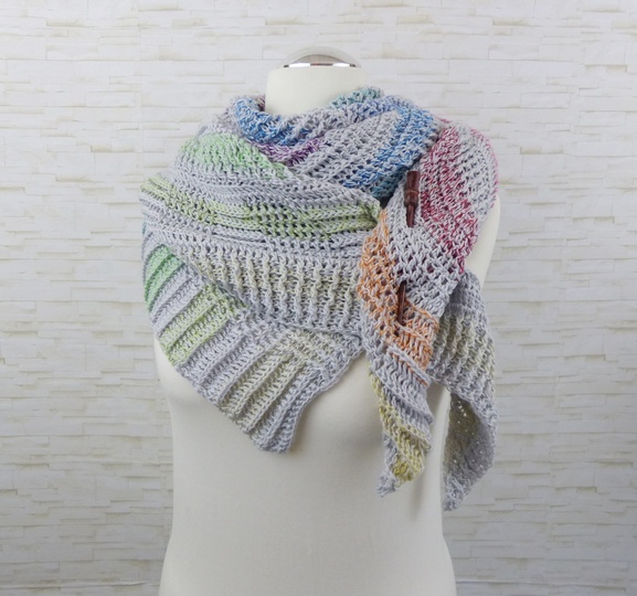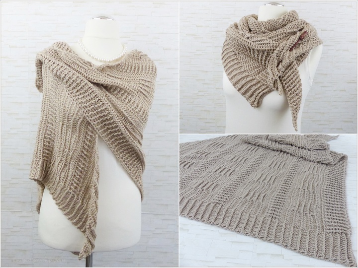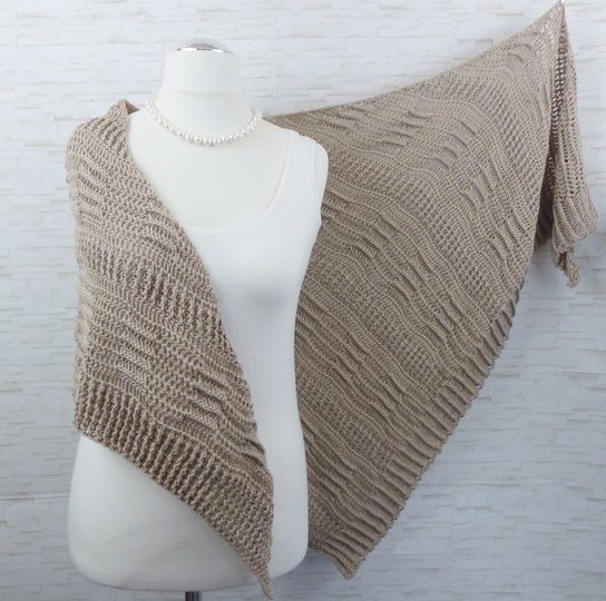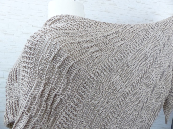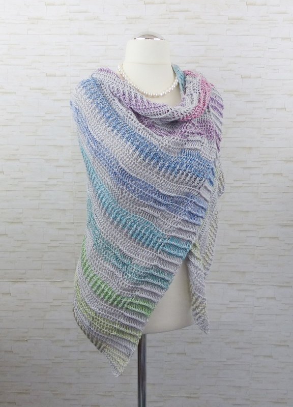 The triangular shawls shown have a width of approx. 195 cm / height approx. 75 cm (1200 LL). However, you can determine the size yourself. The shawl is crocheted from the side, therefore slightly asymmetrical.