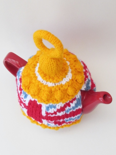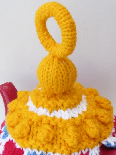 The ball and hoop on the top of the cosy are knitted separately and sewn on top. The added height gives this cosy more status and the loop is perfect for hanging up the cosy when it's not in use.
