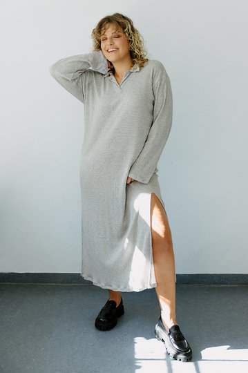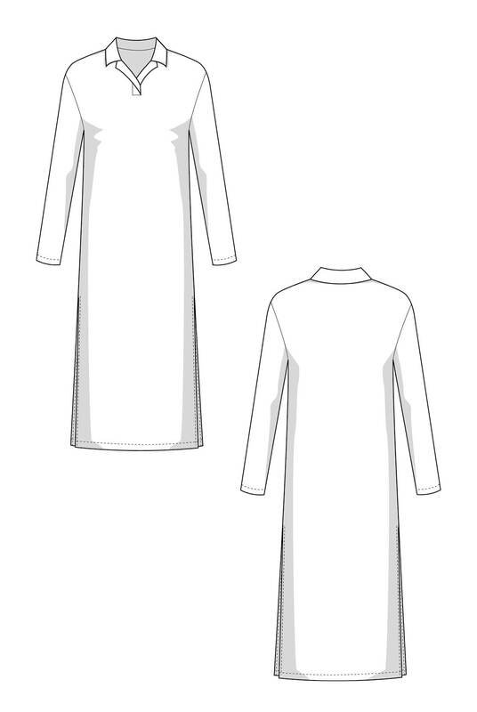 The polo dress pattern for women cleverly combines the airy lightness of dresses with the sporty charm of the polo shirt. The women’s polo dress pattern is cut as a maxi dress with two side slits, long sleeves and a polo collar. This unique combination creates a new favorite look for cosy autumn and winter days that is not only trendy but also incredibly comfortable. It is also a stylish choice for the office. The polo dress pattern includes sizes XS-XXXL.
