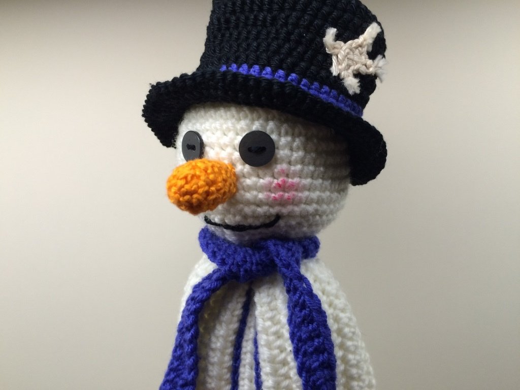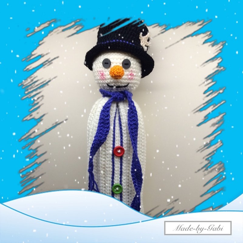 Wie es sich für einen Schneemann gehört, hat er eine Möhren-Nase, einen alten schwarzen Hut mit einem Flicken, rote Bäckchen von der Kälte, einen dicken Schal um den Hals, bunte Knöpfe an seinem Bauch und ein paar kleine Schneekristalle, die unten an seinen Füßen glitzern.