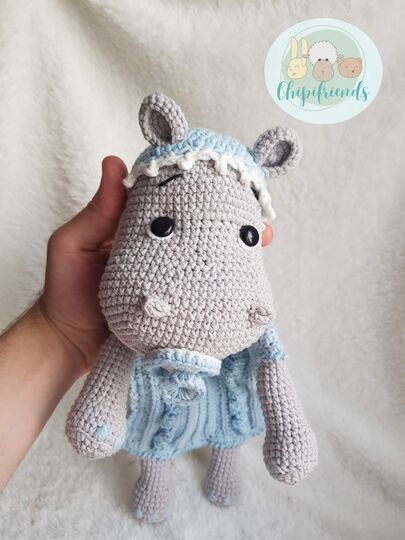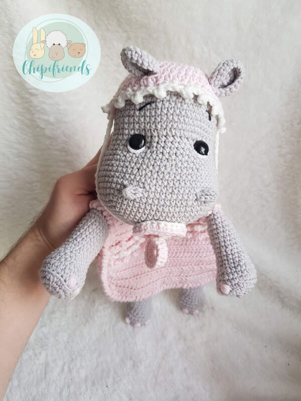 The pink hippo is 28 cm tall and the blue hippo is 33 cm tall, both crocheted with medium cotton yarn and hook sizes 2mm and 3mm.