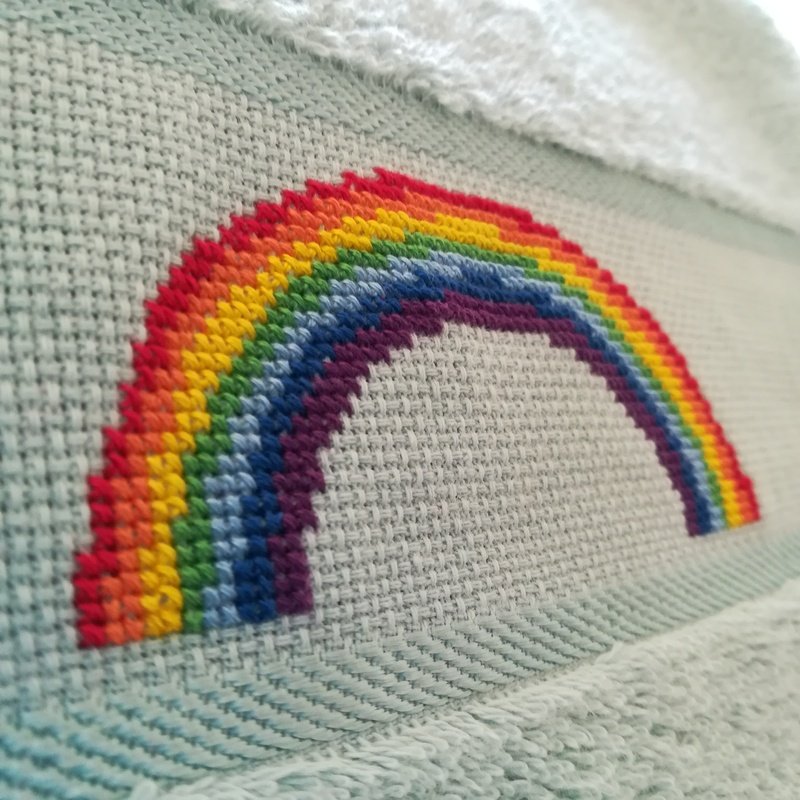 The rainbow is embroidered in full cross stitches and is very suitable for beginners.