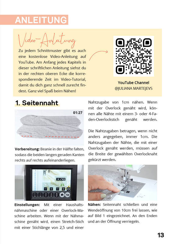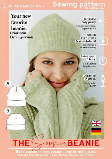 The sewing pattern for a beanie in two possible lengths. With written, illustrated sewing instructions and free video tutorial on our YouTube channel JULIANA MARTEJEVS - Das DIY-Modelabel or julianamartejevs. com