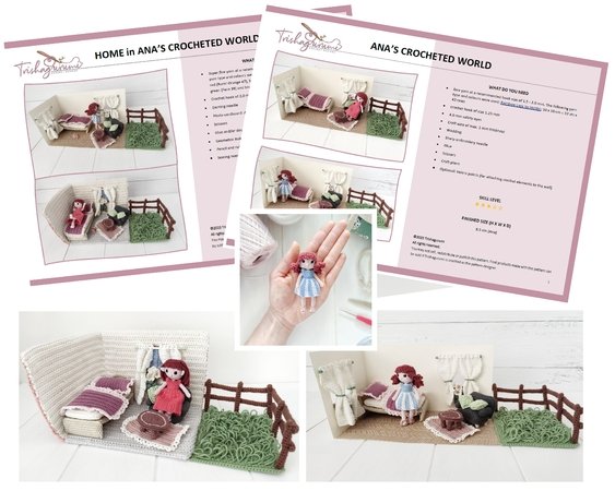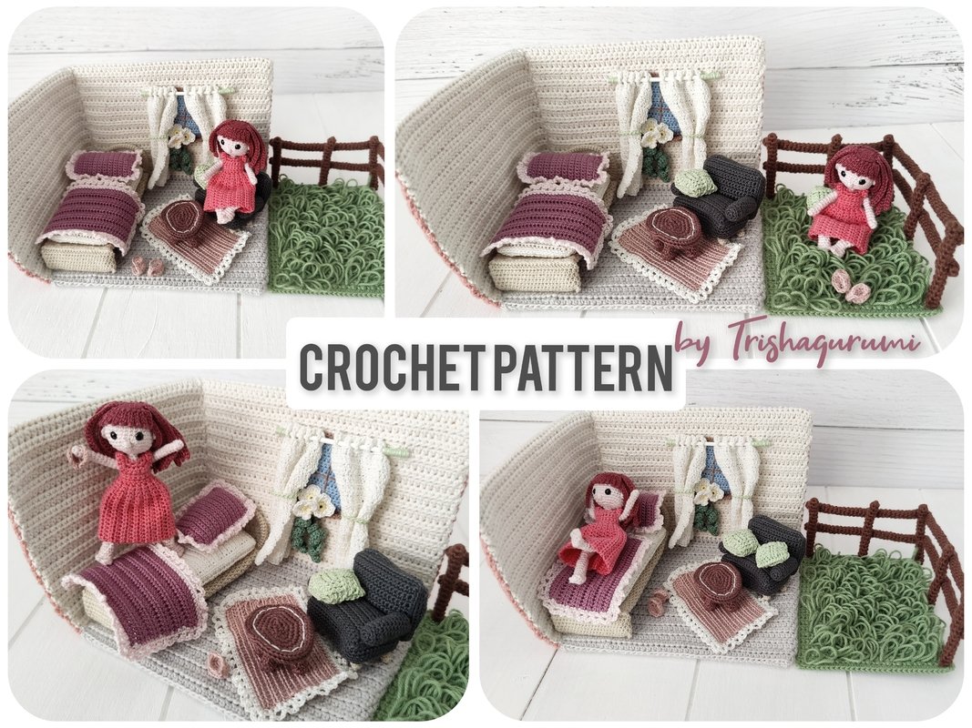 This pattern set is the first (basic) set of Ana’s Crocheted World – a crochet project that aims to create an entire crochet world in a dollhouse format (with many more furniture ideas, seasonal details for Ana and home adjustments).