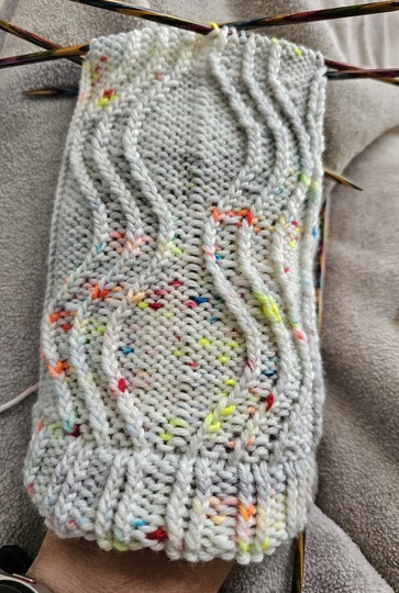 Es wird verzopft. Ansonsten solltet ihr rechte, linke und rechts verschränkte Maschen können.