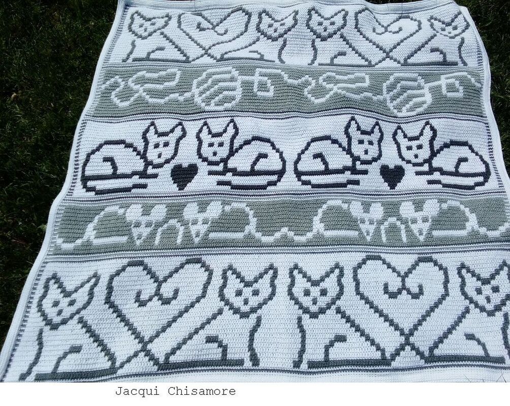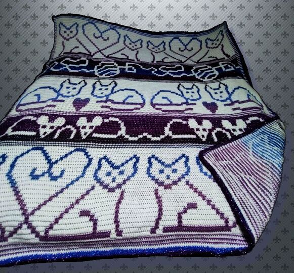A queen sized blanket with adorable whimiscal kitties, some with heart tails, mice, and yarn balls. For the Kitty lover in your family.