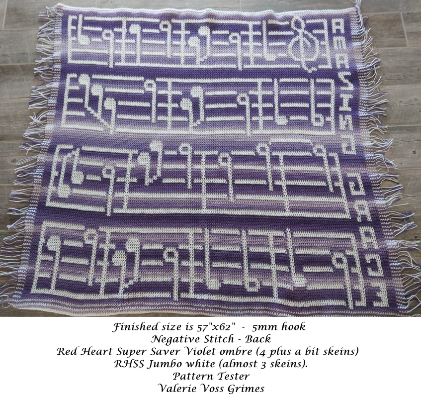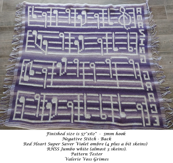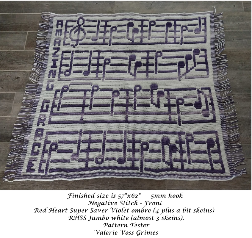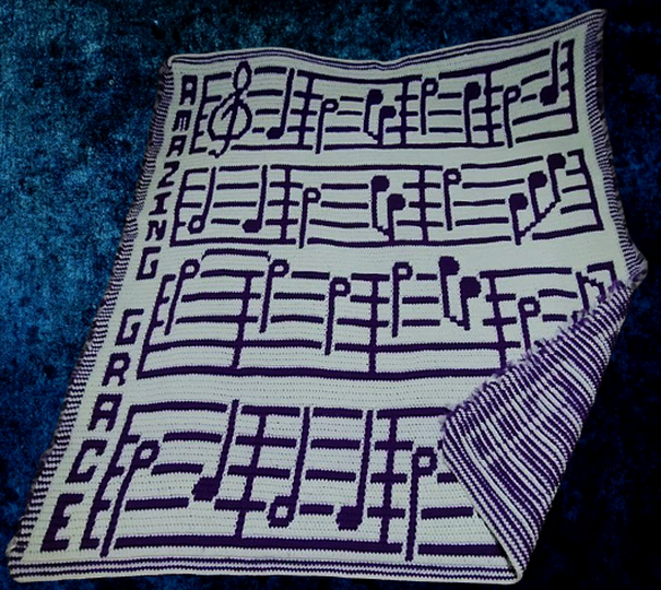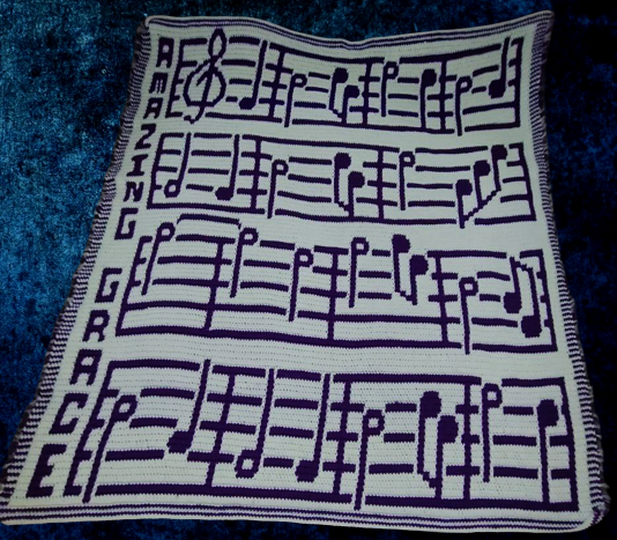 A fun and inspirational pattern using an artistic expression on this rendition of sheet music for the public domain song ‘Amazing Grace’ on a full-sized blanket lapghan.