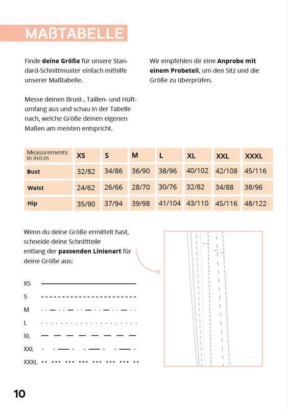 The sizes XS-XXXL are included in the sewing pattern. The exact measurements of the sizes you can see in the size chart in the pictures. For reference, our model Naomi is 170cm (5′ 7″) tall and wears size S. Our model Freia is 173cm (5′ 8″) tall and wears size XXL.