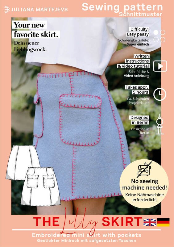 With the mini skirt pattern The Lilly Skirt, you can easily sew a short skirt without a sewing machine using a hand sewing technique. The skirt has a short length and is closed using press studs in the side seam. The skirt pattern has patch pockets at the front. Sew a matching coat without a sewing machine, such as the Nelly Coat or Kelly Coat. The simple hand sewing technique or embroidery technique is explained in written, illustrated sewing instructions and a step-by-step sewing tutorial by Juliana. You can sew the skirt in sizes XS-XXXL.