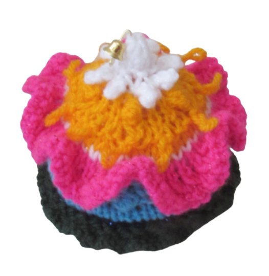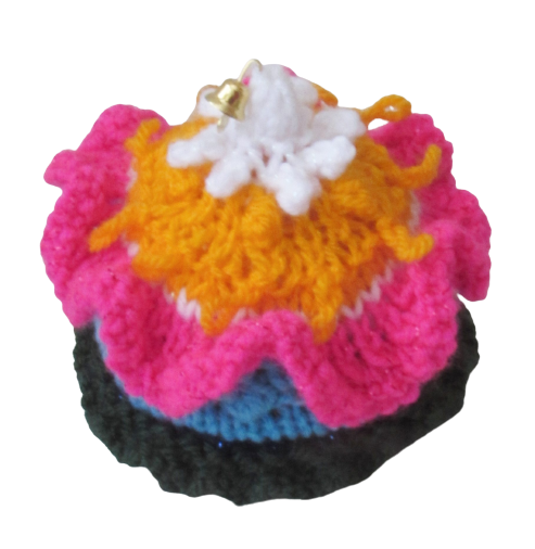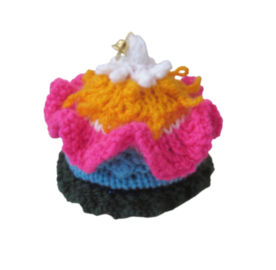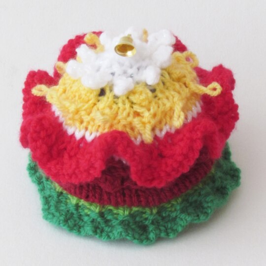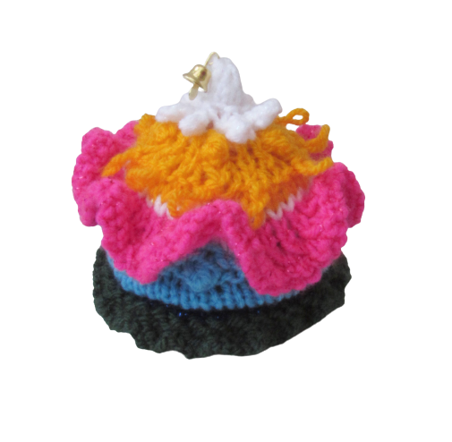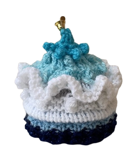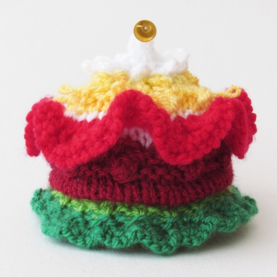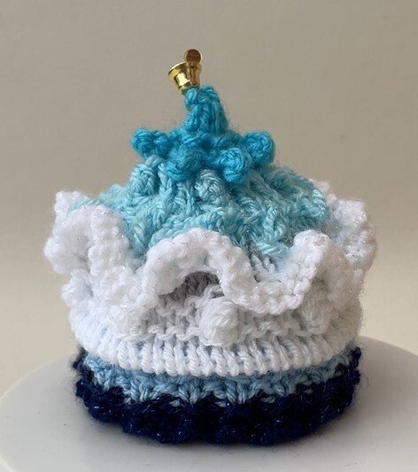 The cosy takes about 2 hours to knit and can be decorated with bells or charms at the top.