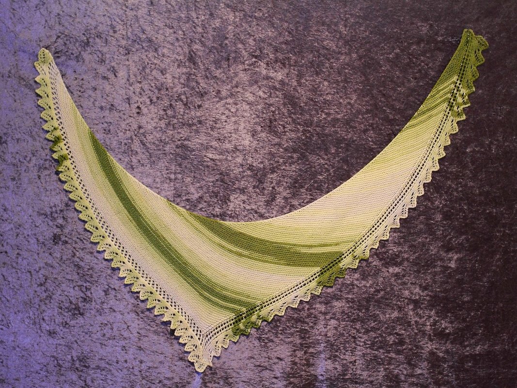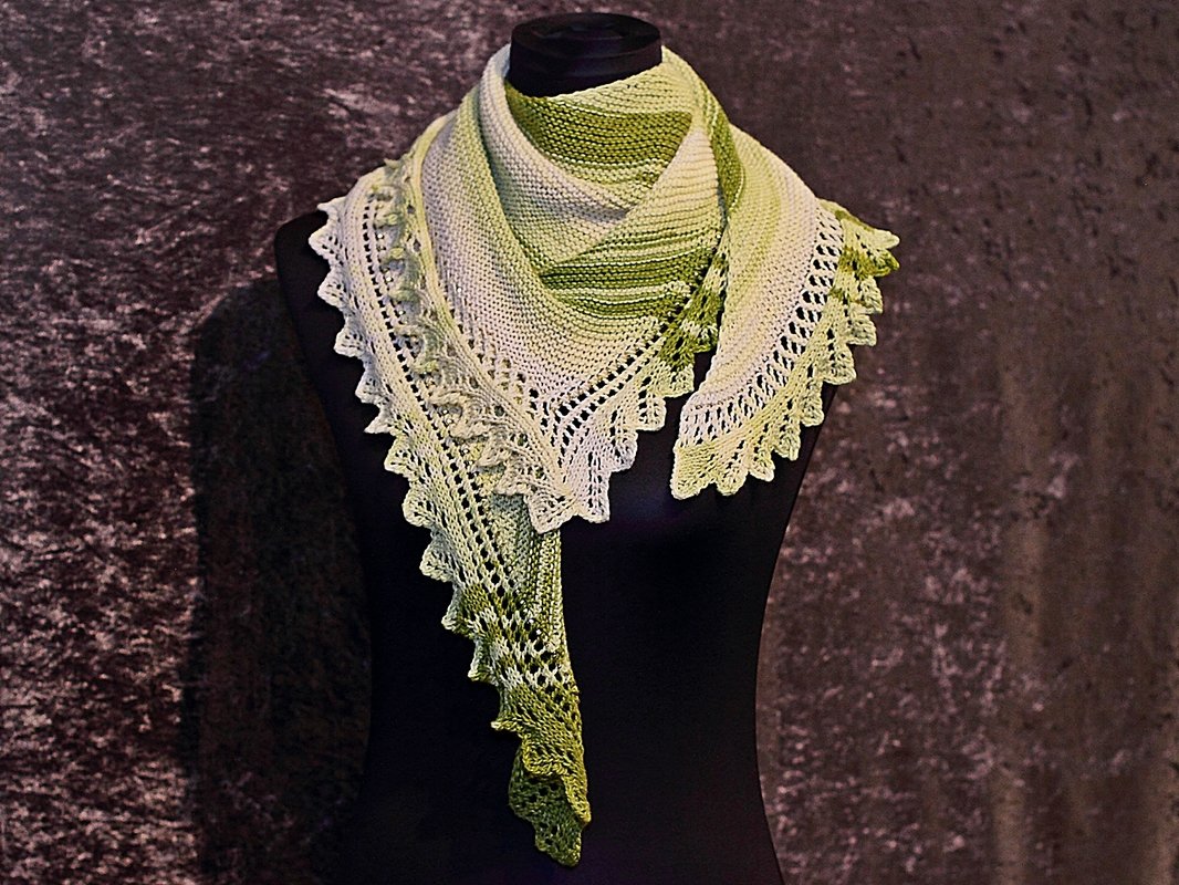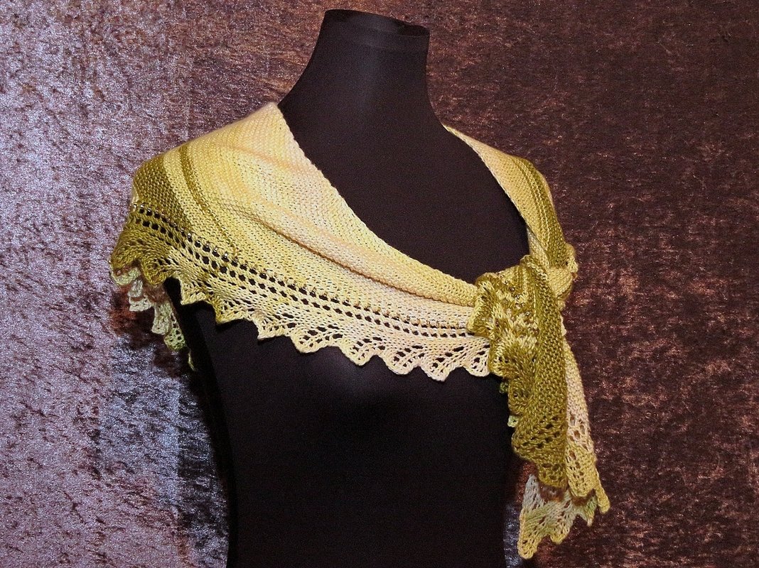 Éowyn is an asymmetrical shawl which is worked sideways. The center section is simply knitted in garter stitch and it is topped off with a easy little border. If you want, you can insert beads.