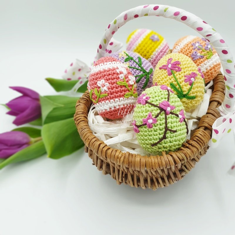 This crochet pattern shows how to crochet decorative Easter eggs with embroidered flowers.