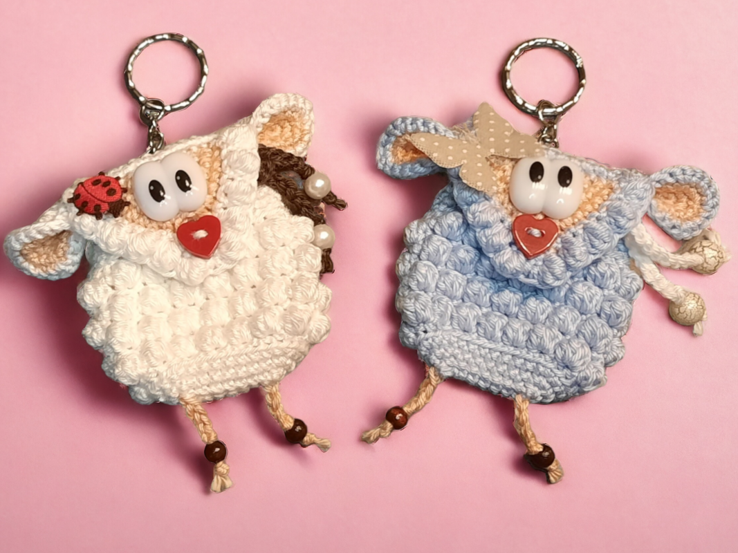 These cute keychains are great for using leftover wool. They are crocheted very quickly and can be decorated however you like. Money or other small things find space in the lamb's stomach.