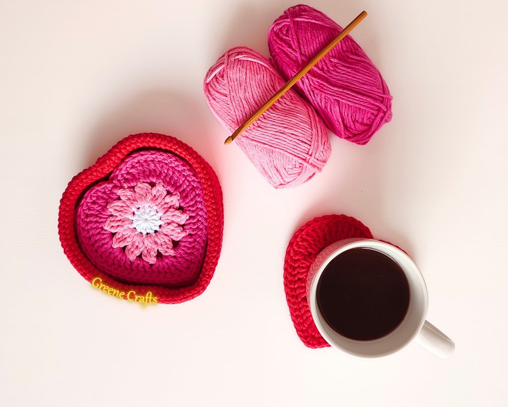 A quick and easy project for Valentine’s Day! These coasters are beautiful in one color, but if you’re looking for something more vibrant, you can use three colors to highlight the floral motif in the center. The coasters fit perfectly into the heart-shaped basket, making them easy to store.