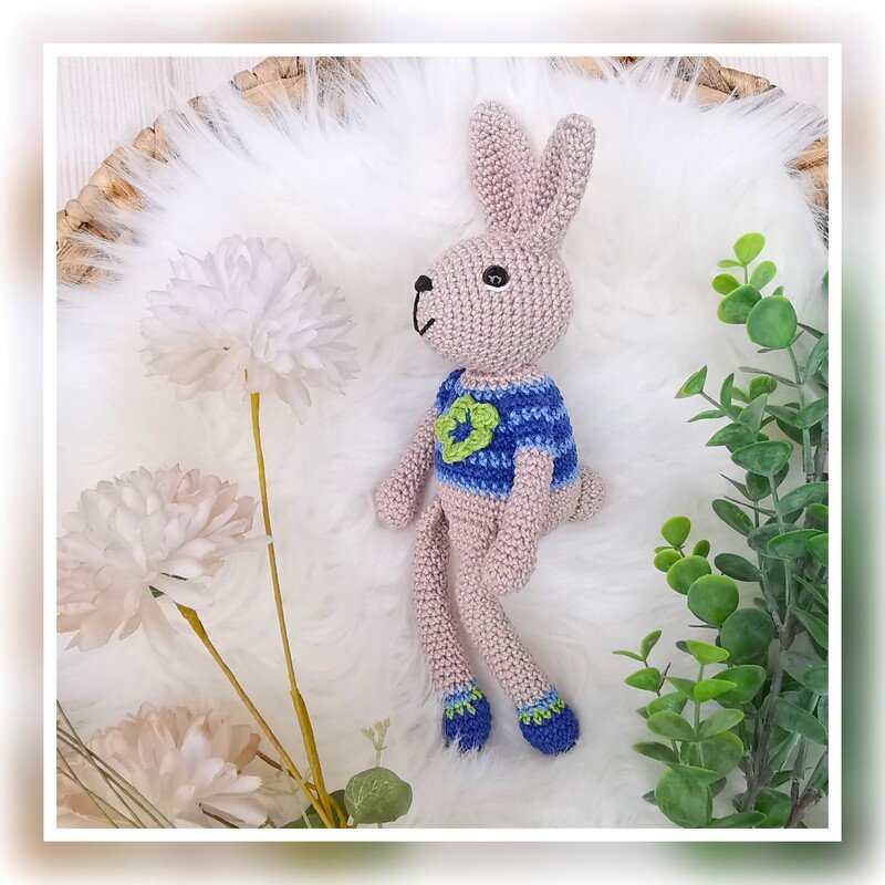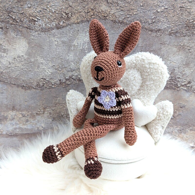 This cute little bunny here is really easy to make. The arms and legs will be crocheted in. You’ll only have to sew on the ears and the head. Mr. Bunny has dangling legs and thus can only sit and not stand unsupported.