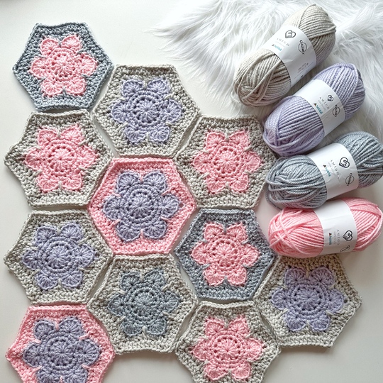 The full hexagon: 8” / 20 cm measured on widest point AFTER BLOCKING