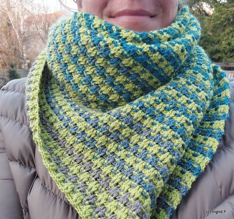 The dense post double crochets make it really soft and cuddly and you feel good being hugged. The scarf can be worn from both sides and the pattern is also perfect as a unisex pattern.