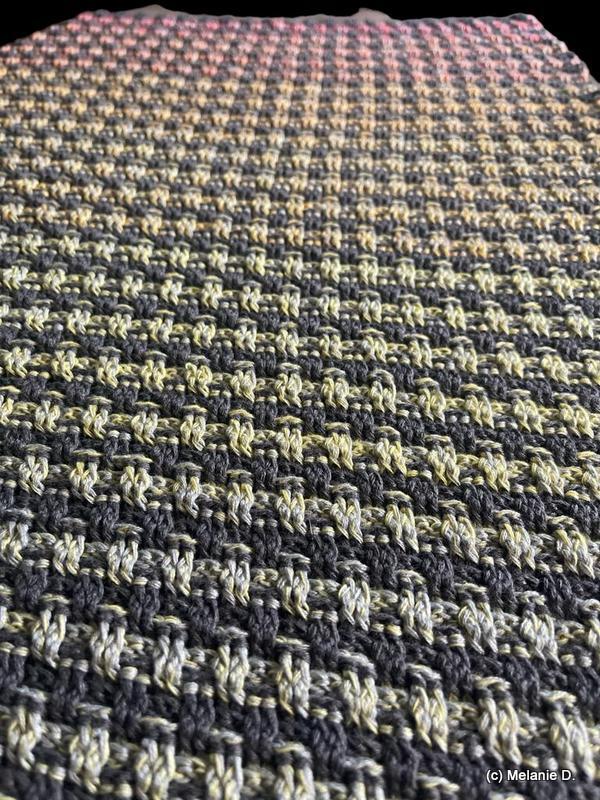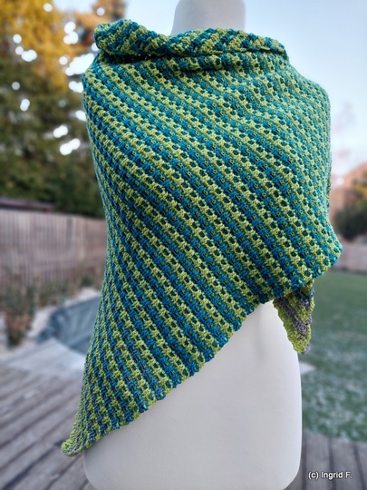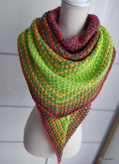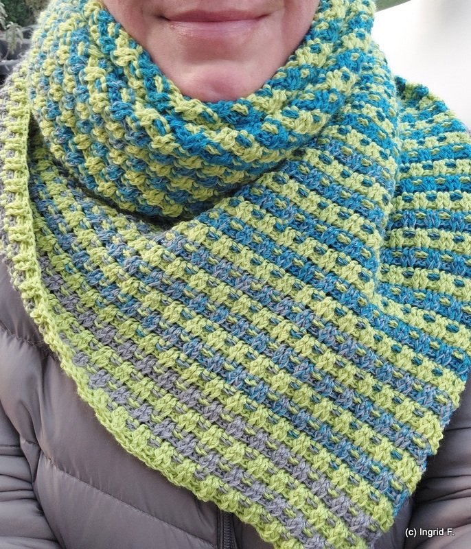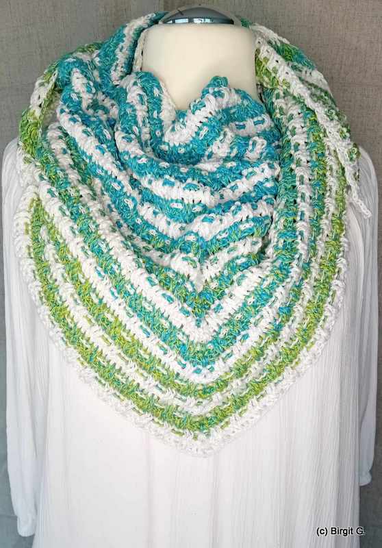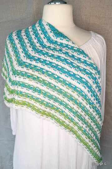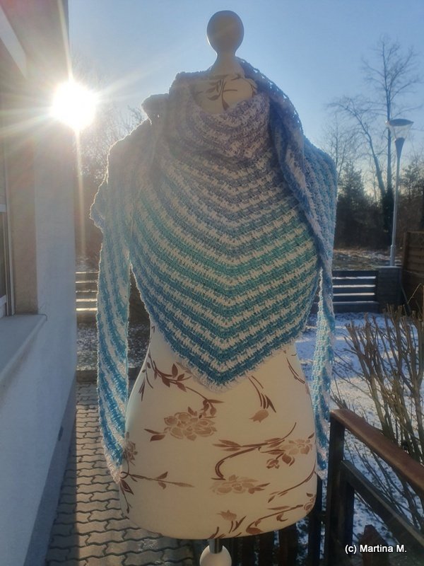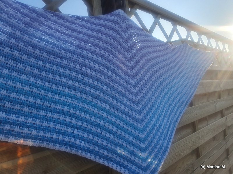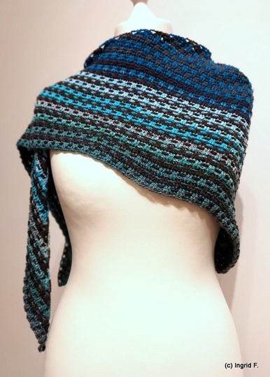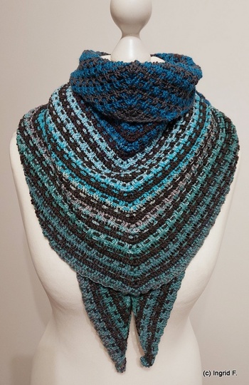 I used 2 bobbles with 500 m each, 4-ply for my version. 168 x 45 cm outcome