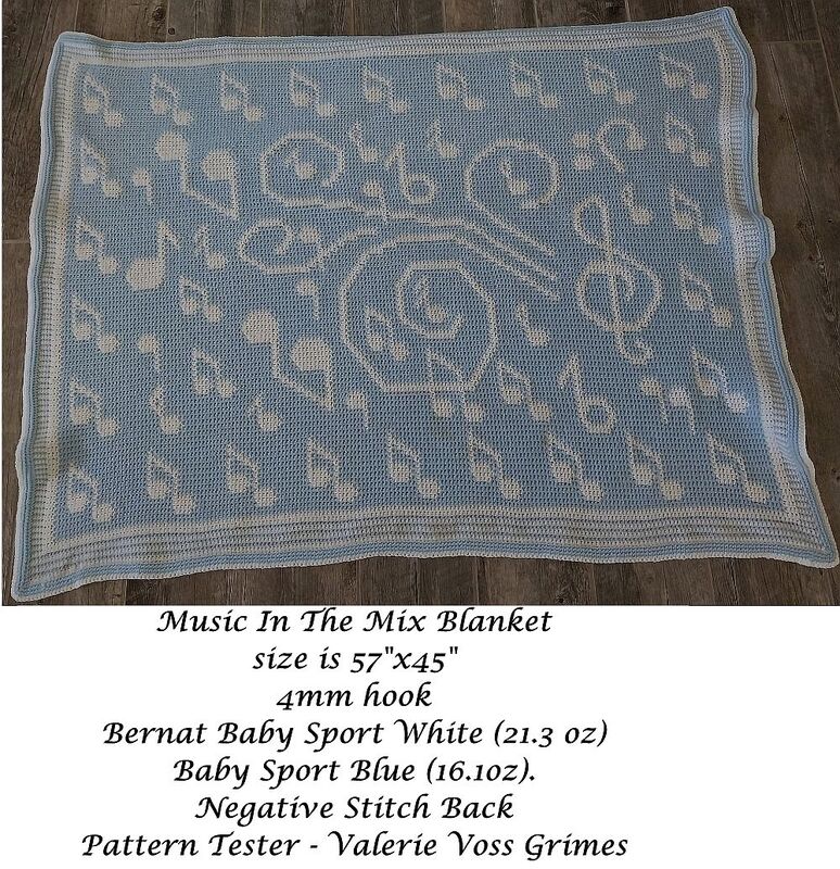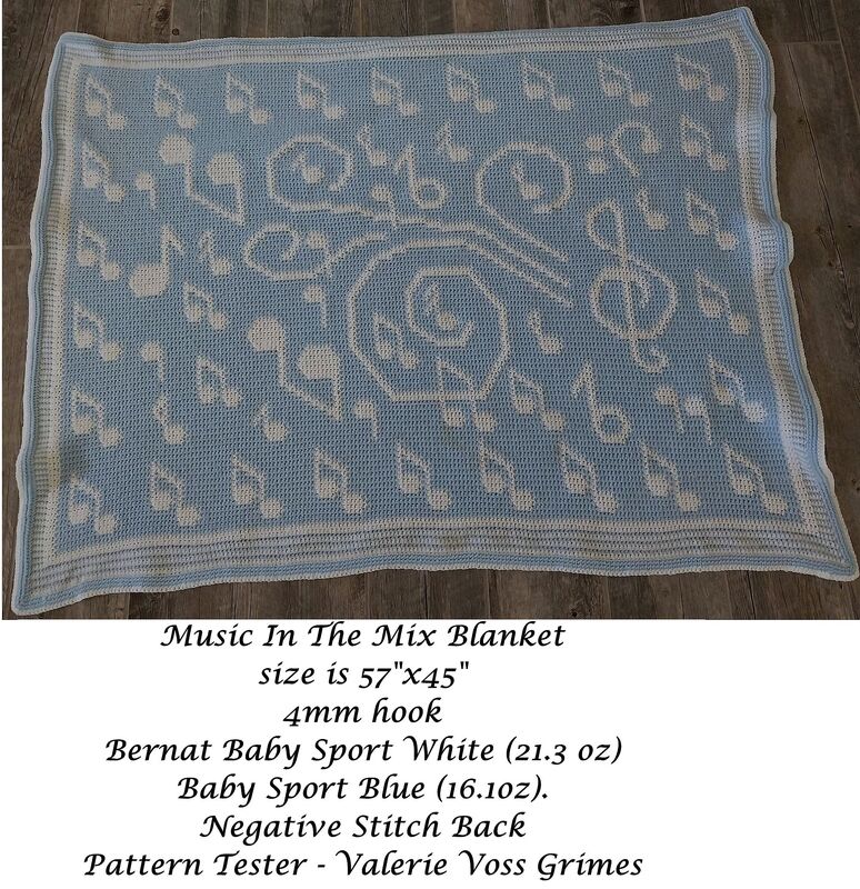 A fun crochet pattern with a warm, joyfully fun burst of musical notes design, full-sized blanket, for the music lover in your life.