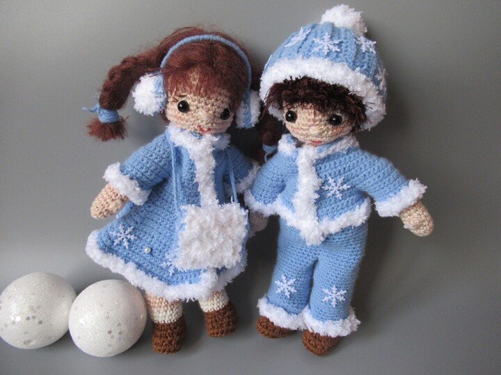 Für meine Häkelpüppchen Anna und Anton habe ich diese Winterkleidung entworfen. Das Set ist ein Ergänzungsset zu "Anna und Anton, die kleinen Gratulanten" ( https://www.crazypatterns.net/de/items/90919/haekelanleitung-anna-und-anton-die-kleinen-gratulanten) und besteht aus einem Overall und einer Bommelmütze für Anton, sowie einem Wintermantel, Ohrenschützern und einem Muff für Anna. Die Anleitung für die Puppen ist nicht inbegriffen..