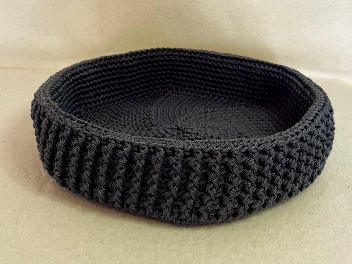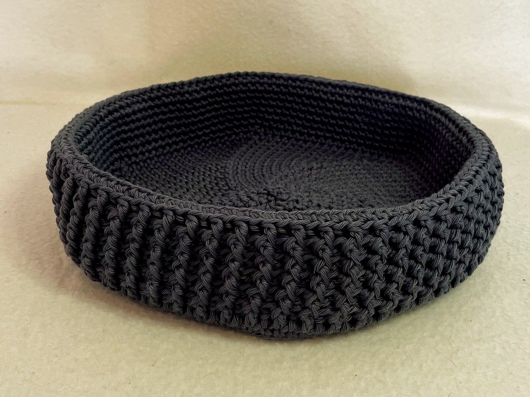 Die Größe variiert je nach Garn und Nadelstärke. Mit der von mir verwendeten Wolle und Nadelstärke wird das Körbchen ca. 30 cm im Durchmesser und ca. 5 cm hoch.
