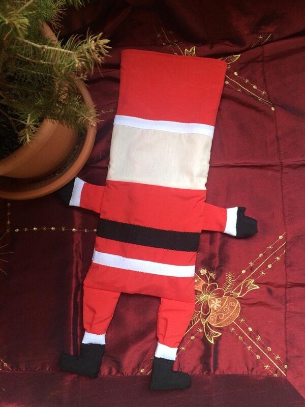 The Santa Claus gift bag is perfect for wrapping smaller gifts. There is also plenty of space to store just sweets. His hat is closed with a pom-pom attached to an elastic band. The arms and legs are movable. The bag, without the arms and legs, measures approximately 16,14 x 7,09 in.