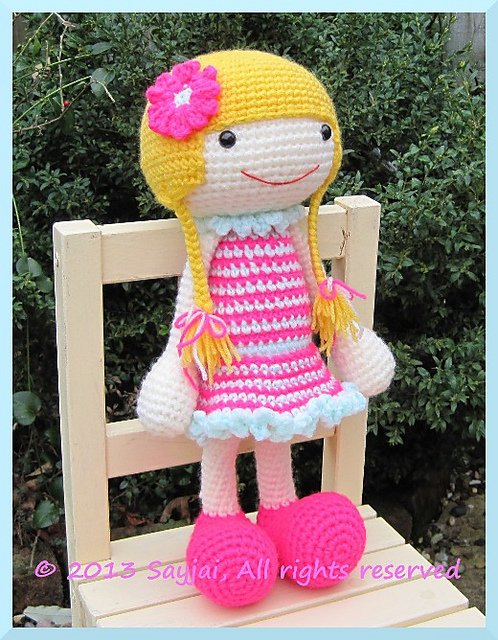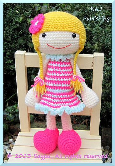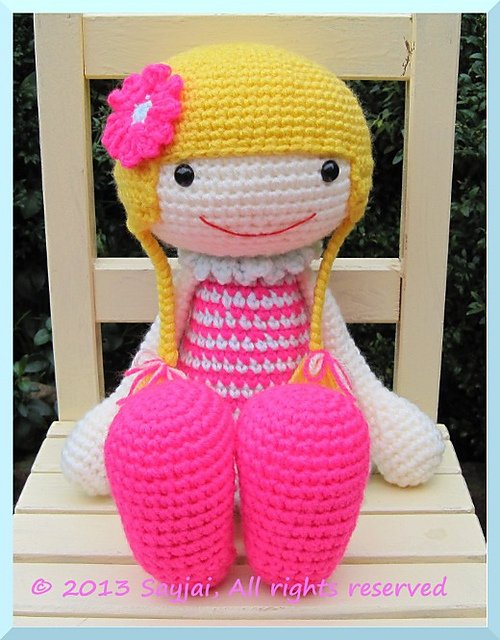 Crochet pattern to create a large doll. The legs and arms can move.