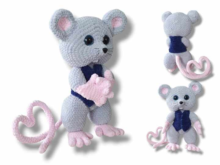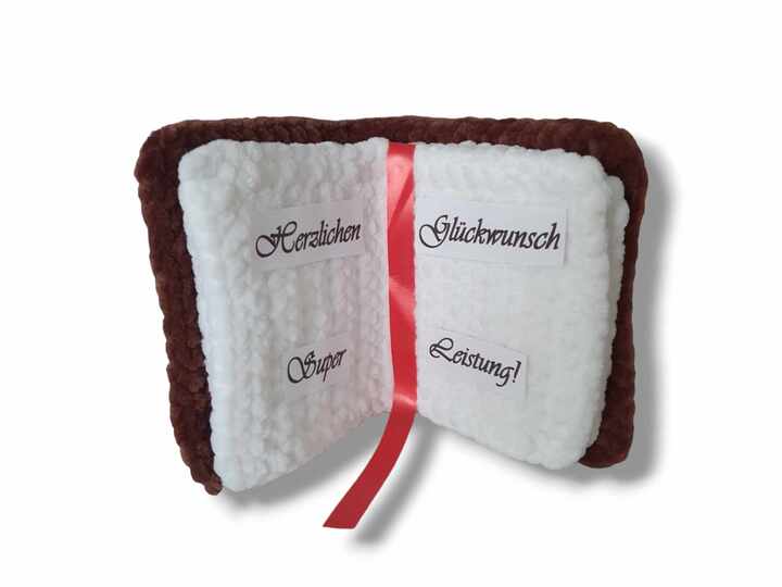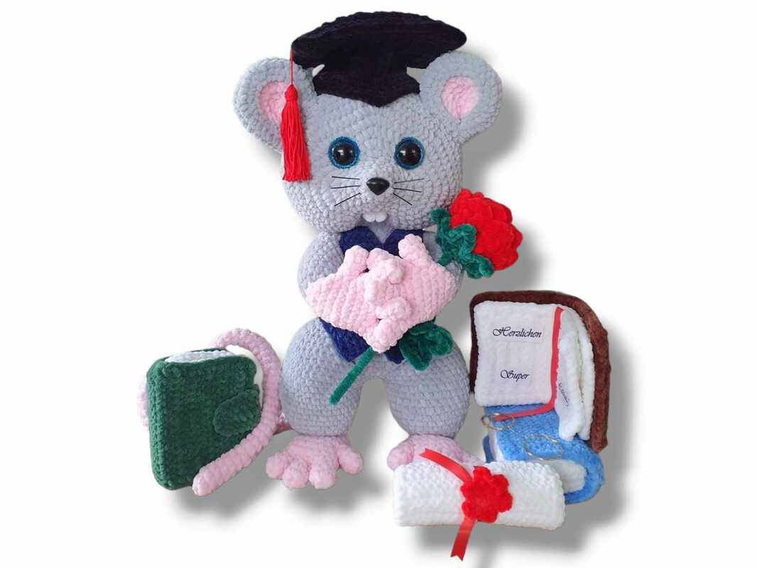 With the help of these step-by-step instructions, you can easily crochet a cute graduate mouse. The instructions also include a description of how to make all the accessories. This applies to all graduate accessories (waistcoat, hat, books, diploma, rose and glasses). One of the books is equipped with a secret hiding place. This offers plenty of space for secrets or gifts. The mouse tail can also be used wonderfully as a stand for a book.