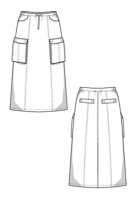 With the cargo skirt pattern, you can sew a modern cargo skirt in midi length.