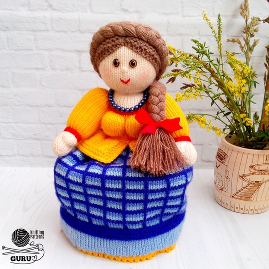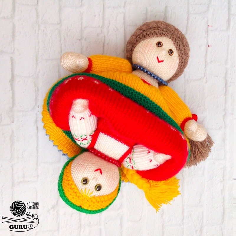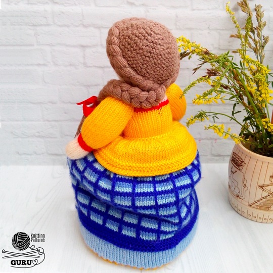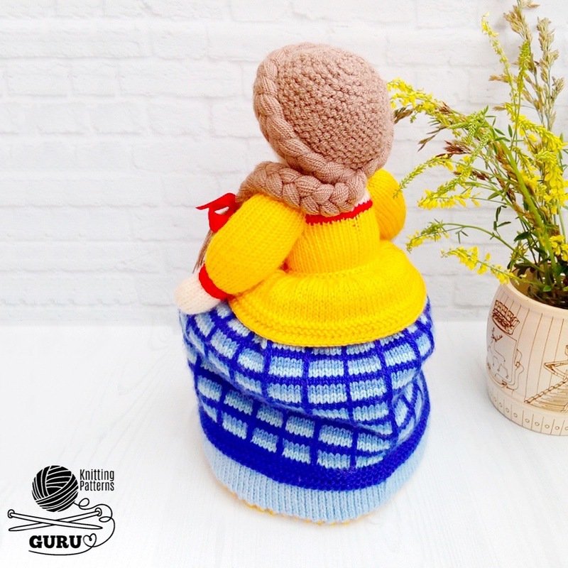 • Main parts are made on 2.5-mm (US 1/UK 13) knitting needles. Hair is made on 3.0-mm (US 3/UK 11) knitting needles. The bow of the girl is made on 2.0-mm (US 0/UK 14) knitting needles.