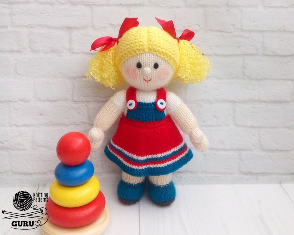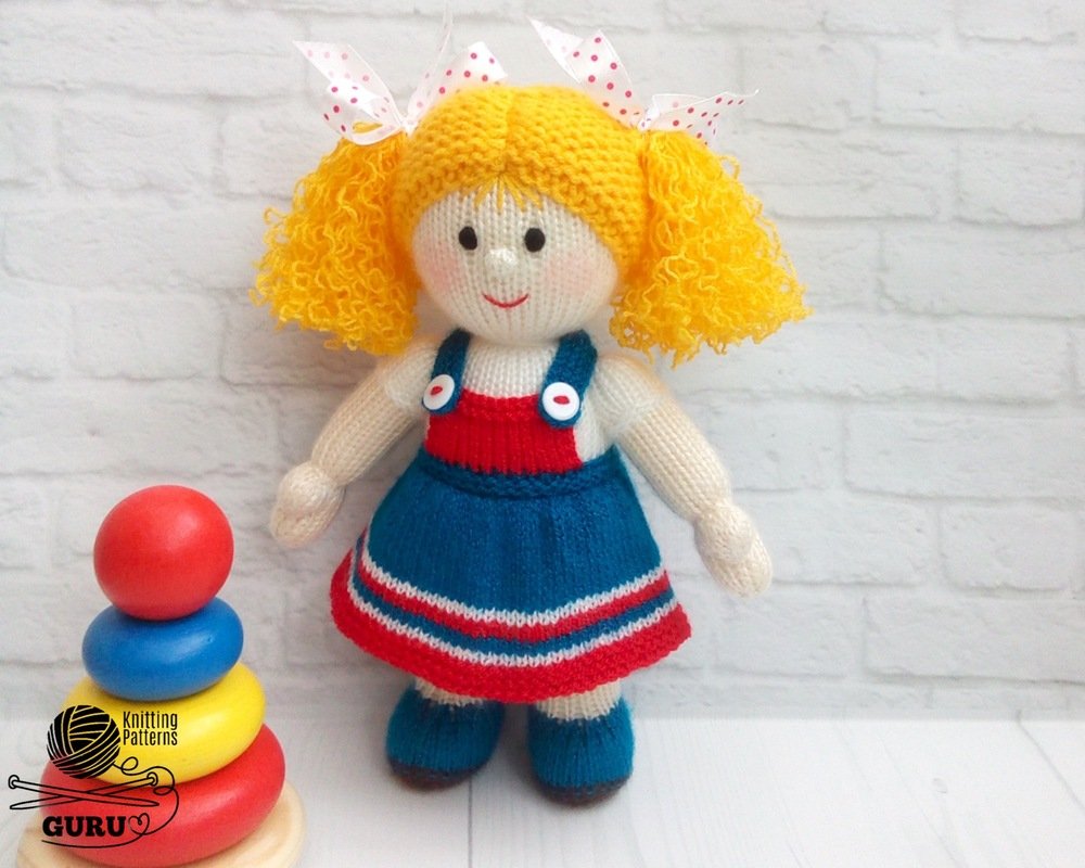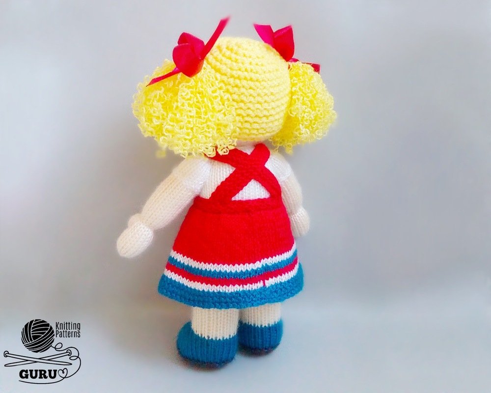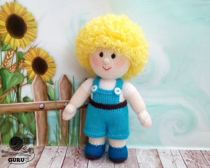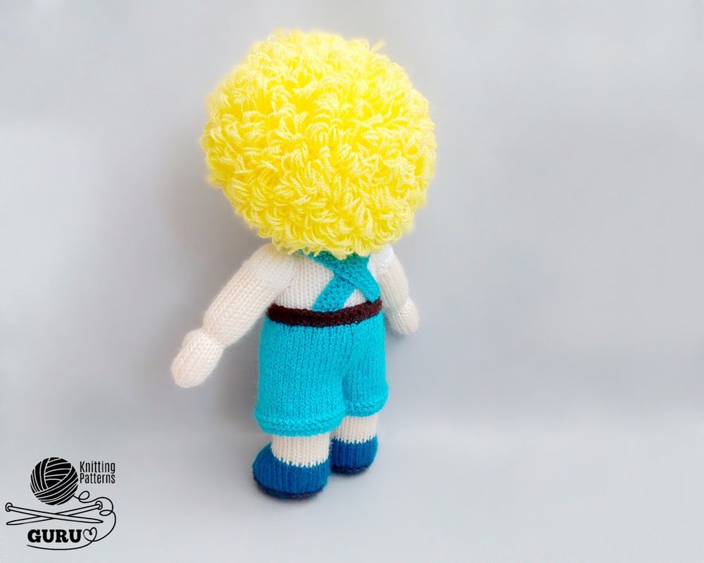 The main parts are made on 2.5-mm (US 1/UK 13) knitting needles. The hair is made on 3.0-mm (US 2/UK 11) knitting needles. The clothes are made on 2.0-mm (US 0/UK 14) knitting needles.