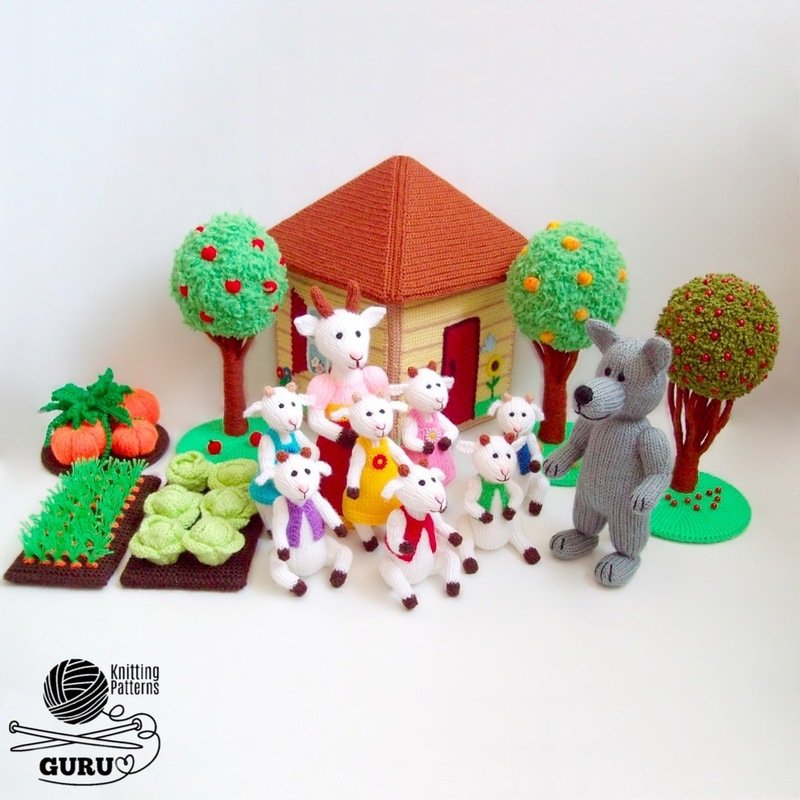 Goat and wolf pattern provides instructions for both knittings with two knitting needles back and forth (flat) and knitting with five knitting needles in rounds.