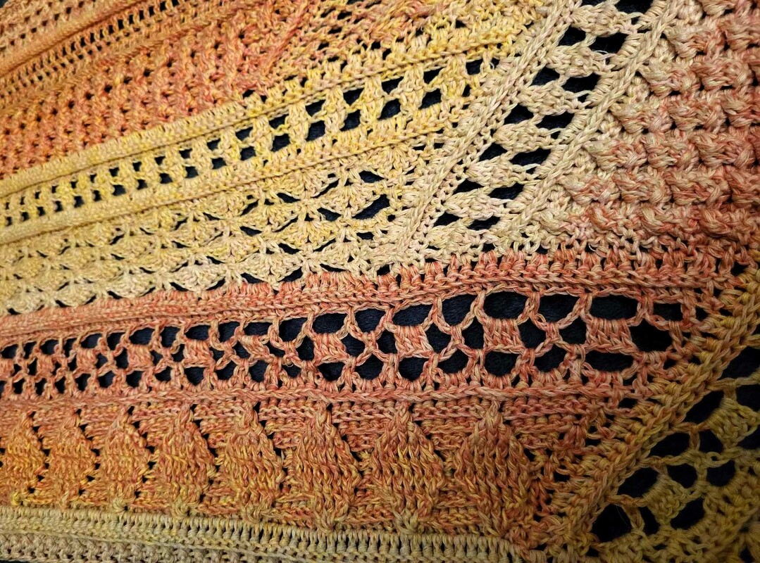 The triangular scarf Kalypso is the flat version of the scarf Akaste, it is also one of the special scarfs where you rotate your scarf regularly to have the beautiful patterns created. The scarf contains 9 different patterns, so you will not get bored while crocheting it.