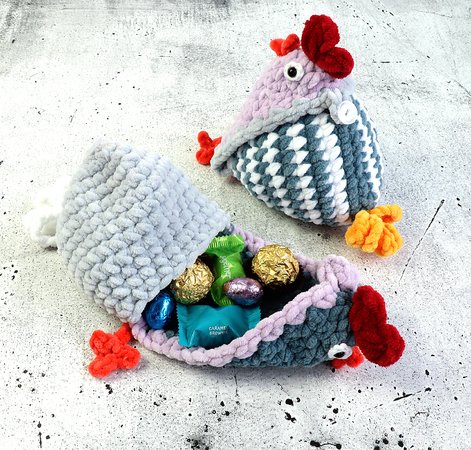 Now the popular fillable hens are also available in a large version. Quickly crocheted with thick chenille wool, it is just the right size for a few Easter sweets. Of course, you can also hide and give away secret messages, money, vouchers, pieces of jewelry, a silk scarf, a tie, socks or other small items.