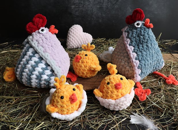 Ich habe für Ostern zehn grosse Hühner und etliche Küken als Geschenke gehäkelt. Hatte noch eine grössere Menge farbiges Effektgarn, dadurch wurden die Tierchen besonders flauschig. Die Resonanz war sensationell. Vor allem, dass man da was reintun kann und die lustigen Baumelbeine fanden alle toll. Ein Paar mit Küken habe ich selbst behalten als super lustige Deko - nicht nur zu Ostern. Danke für die tolle Anleitung. Hat sehr viel Spass gemacht!