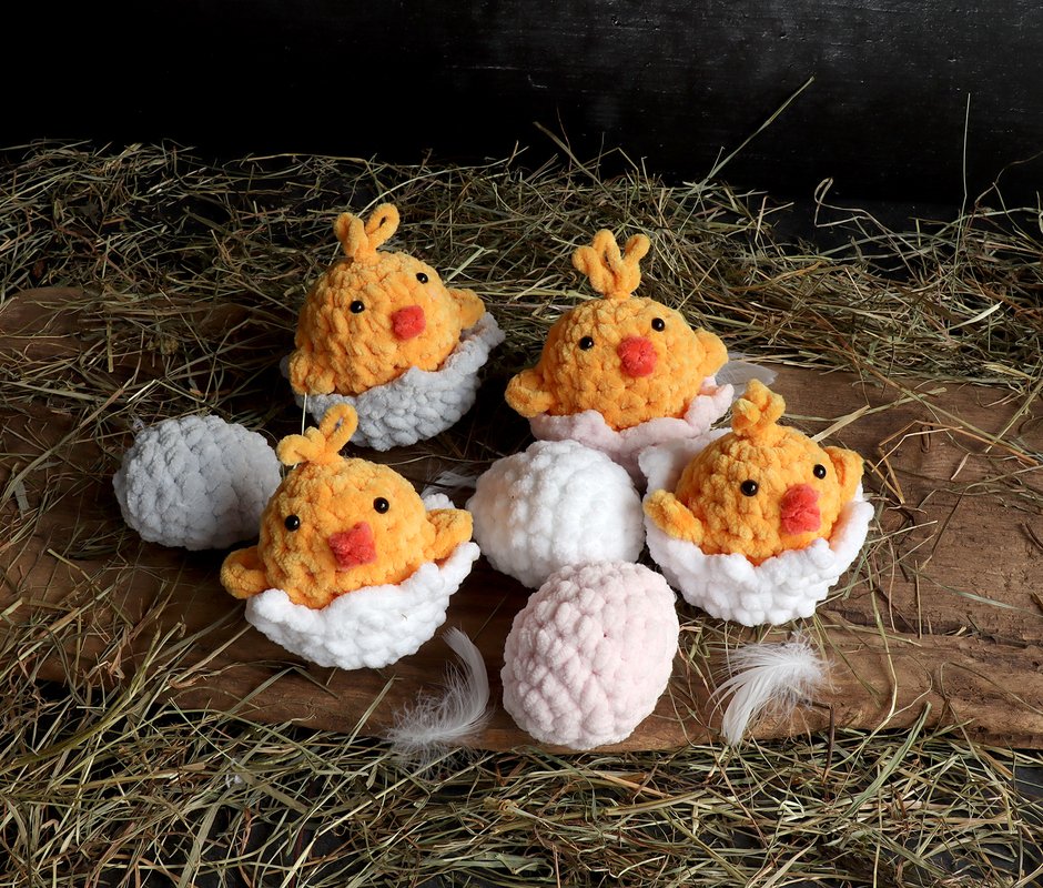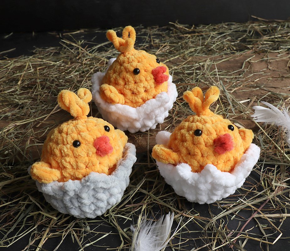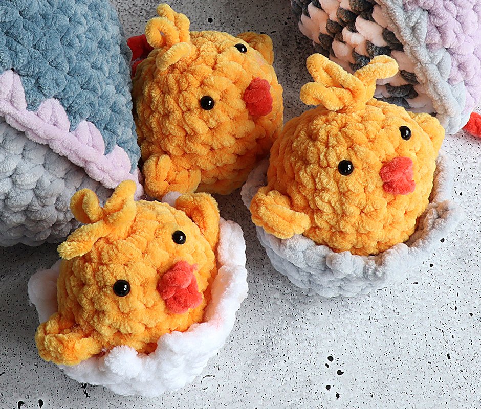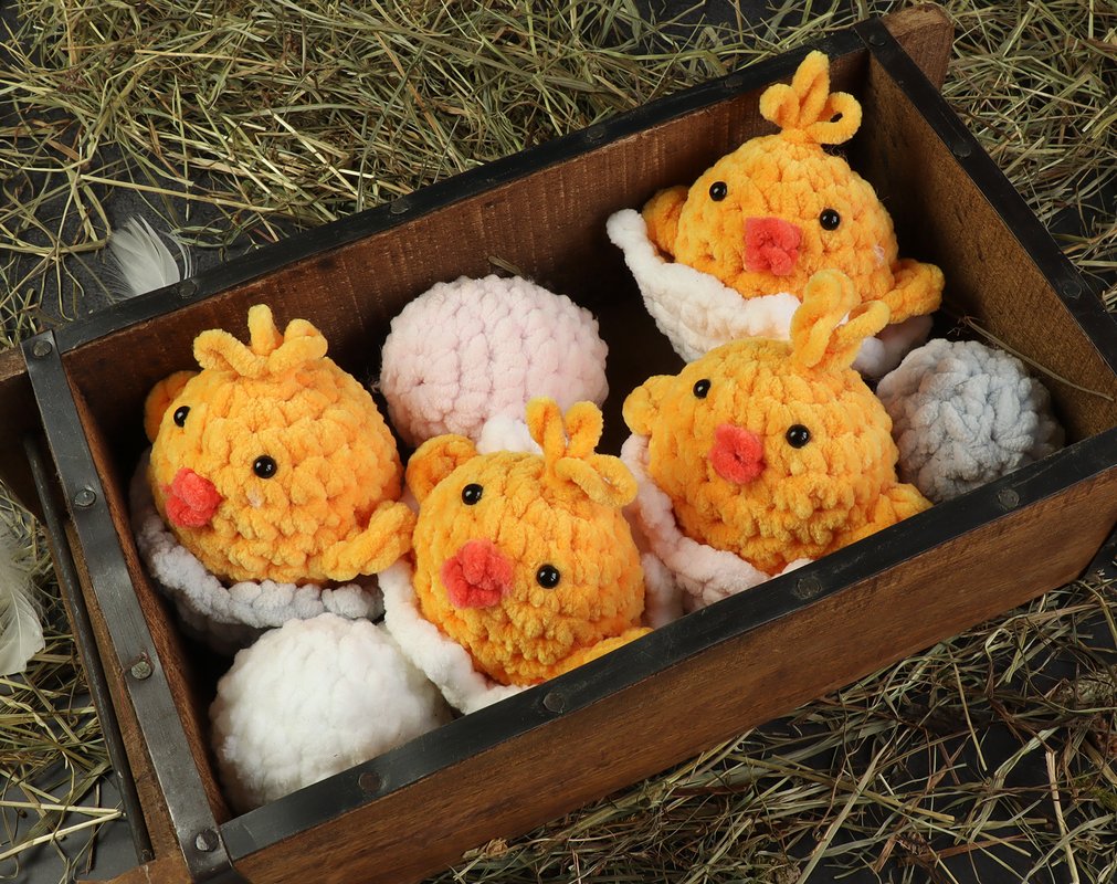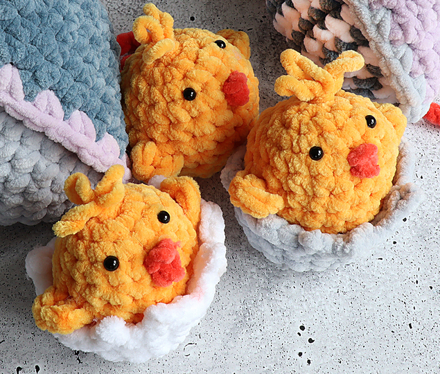 These cuddly little chicks are quick and easy to crochet with thick chenille wool - the special feature here is that the wings are crocheted in directly. So you don't have to sew them on. The eggshells and eggs are just as quick and easy to make - a great project for beginners.