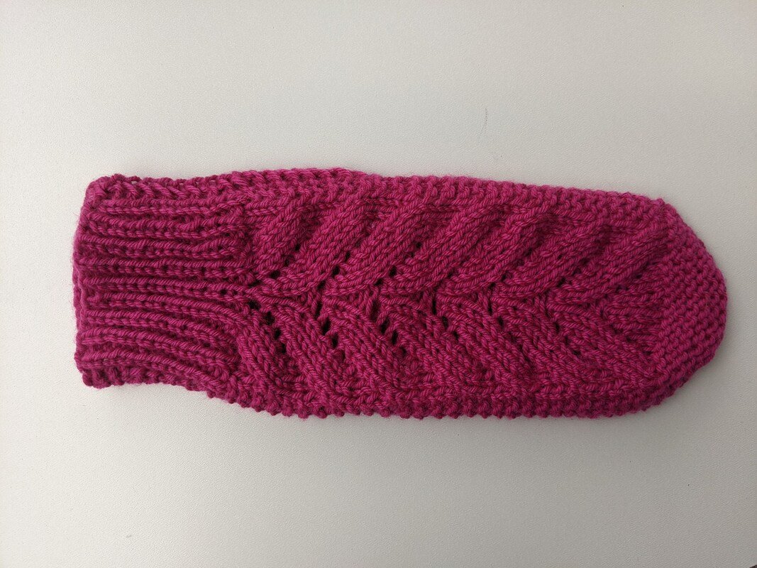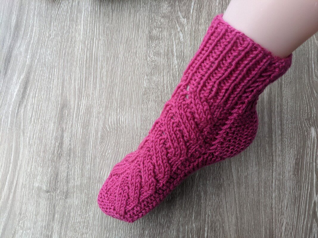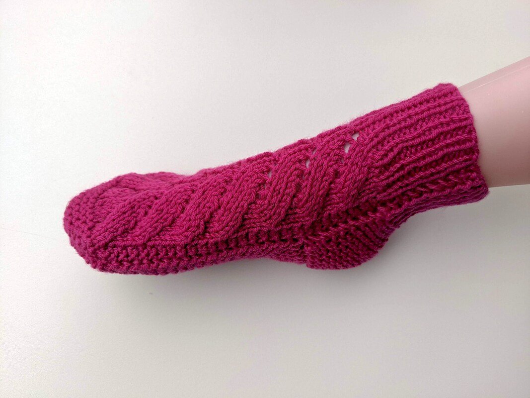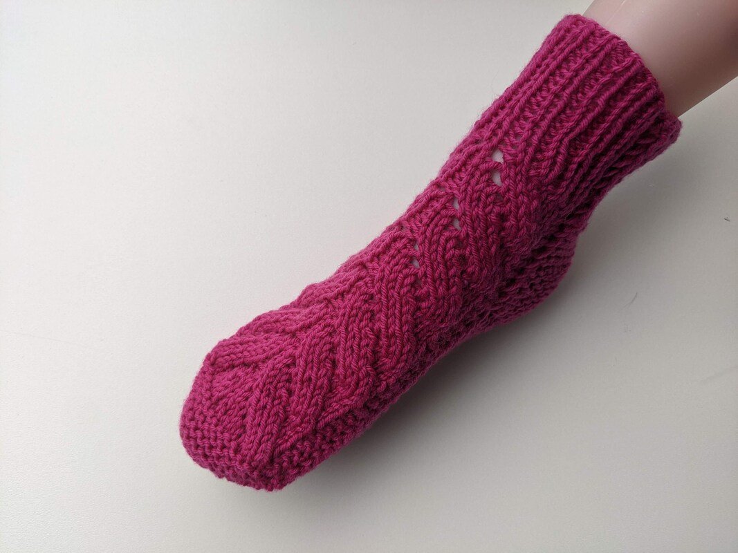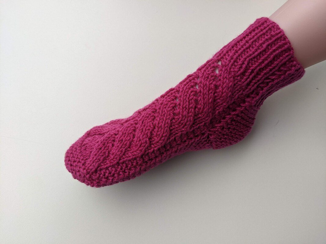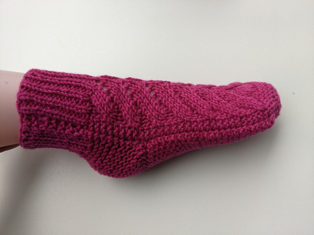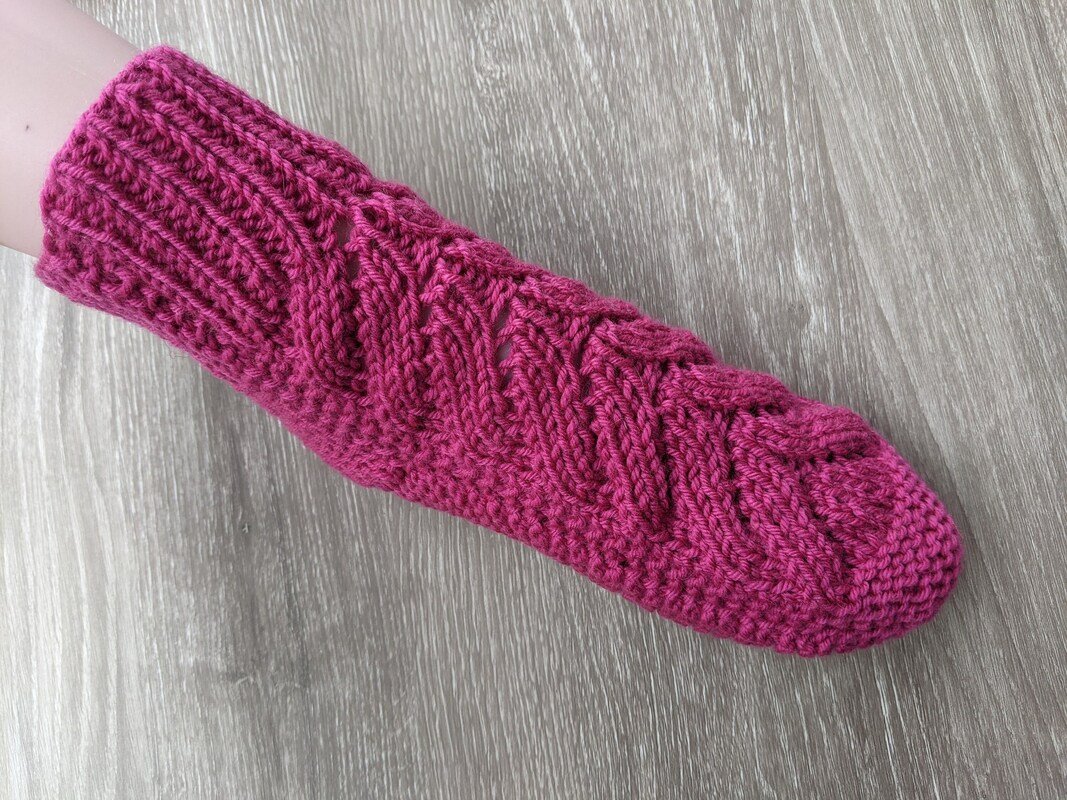 US 6-7 / EU 36-37. The size can be adjusted by knitting the lace part longer or shorter.