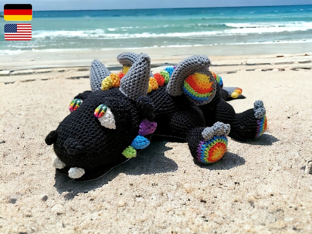 The finished dragon will be about 36cm. Of course, the size can vary depending on whether you crochet tight or loose. The choice of wool is also important. I crochet with cotton yarn 4ply 125m/50g (100% cotton).