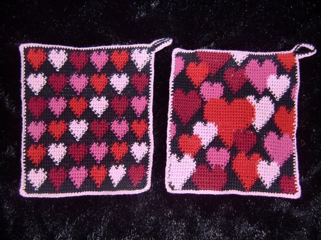 Need a gift for Valentine's Day or a wedding? All four sides of this pair of potholders have different heart designs. The four designs can be mixed and matched using the double face technique.