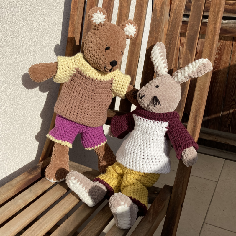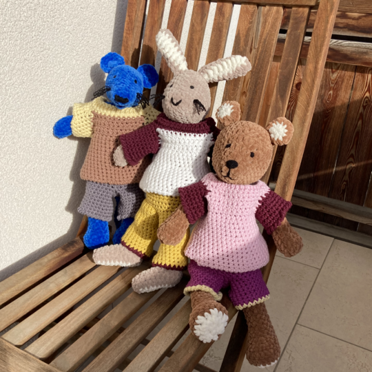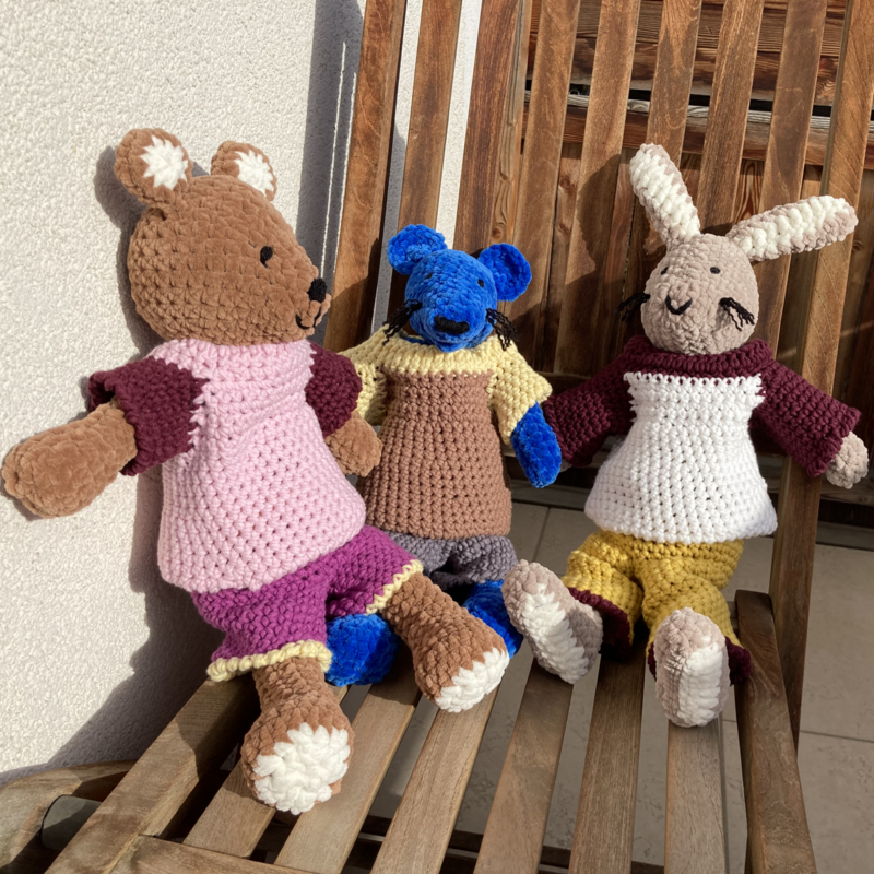 IMPORTANT: The pattern only describes the shirt. The crochet animals and the trousers they are wearing as shown in the pictures are not part of the instructions!